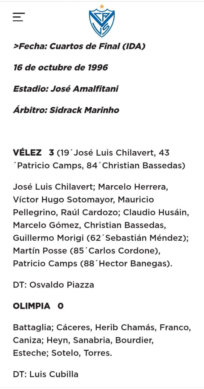 Game: VELEZ SARSFIELD vs OLIMPIA (3-0)