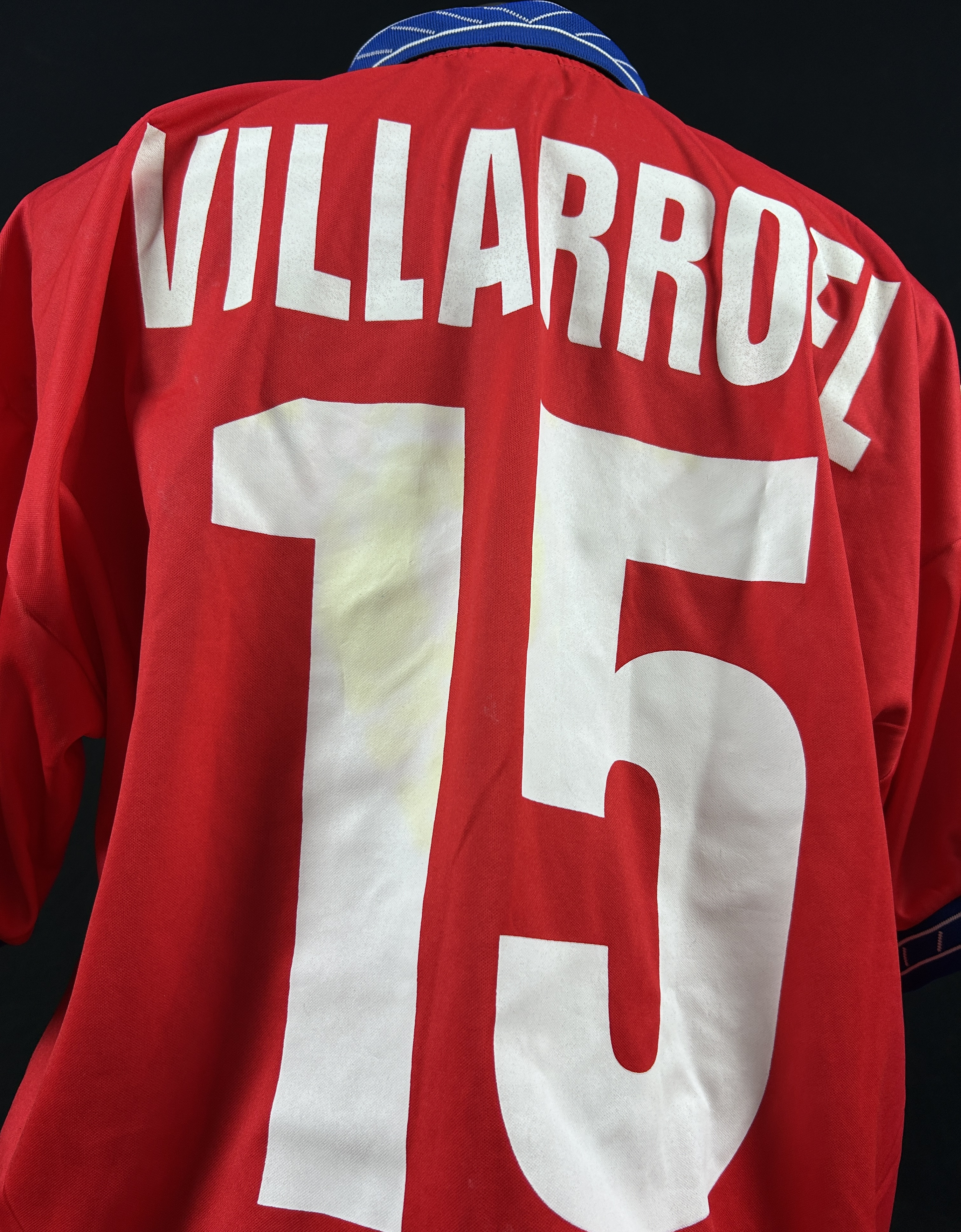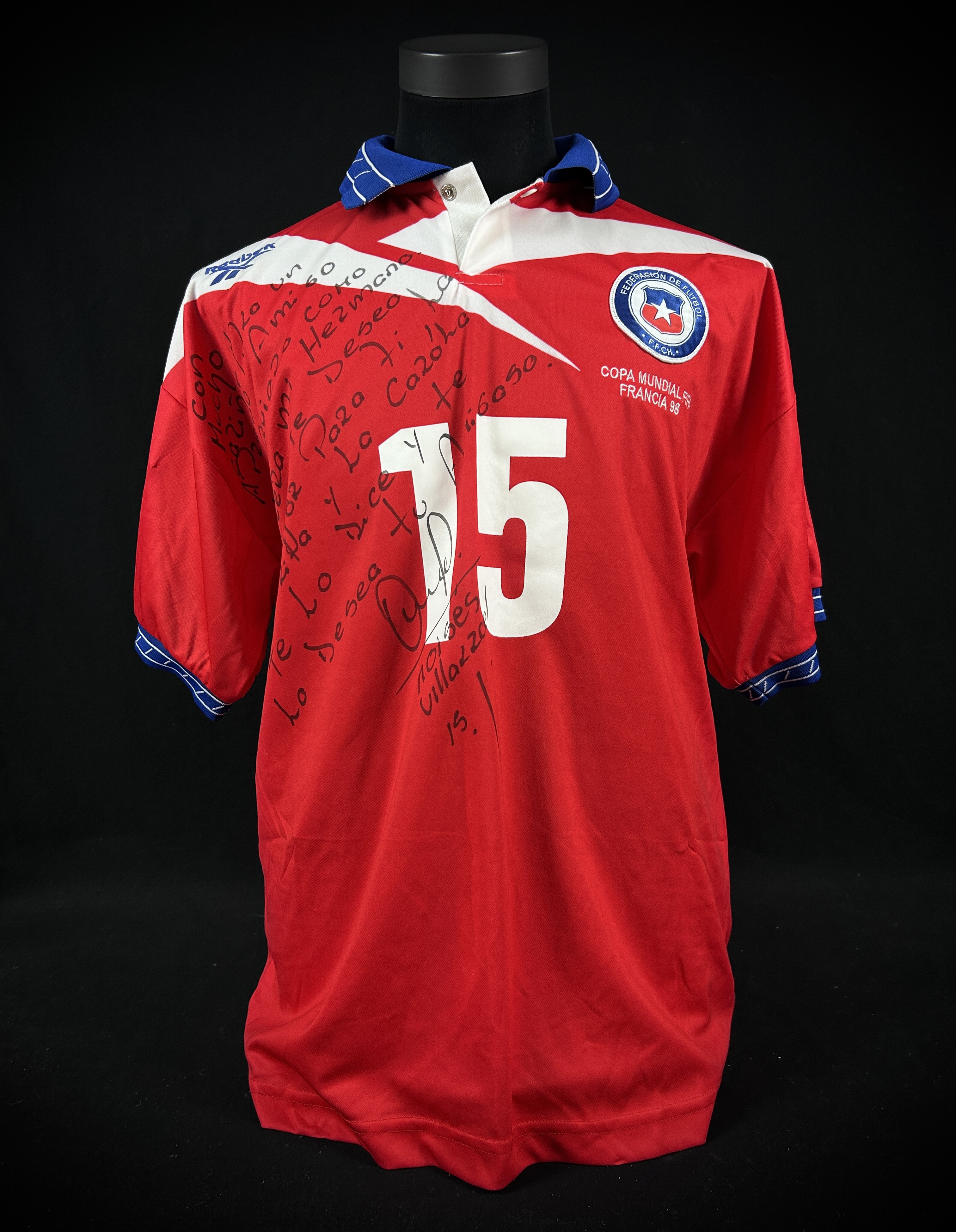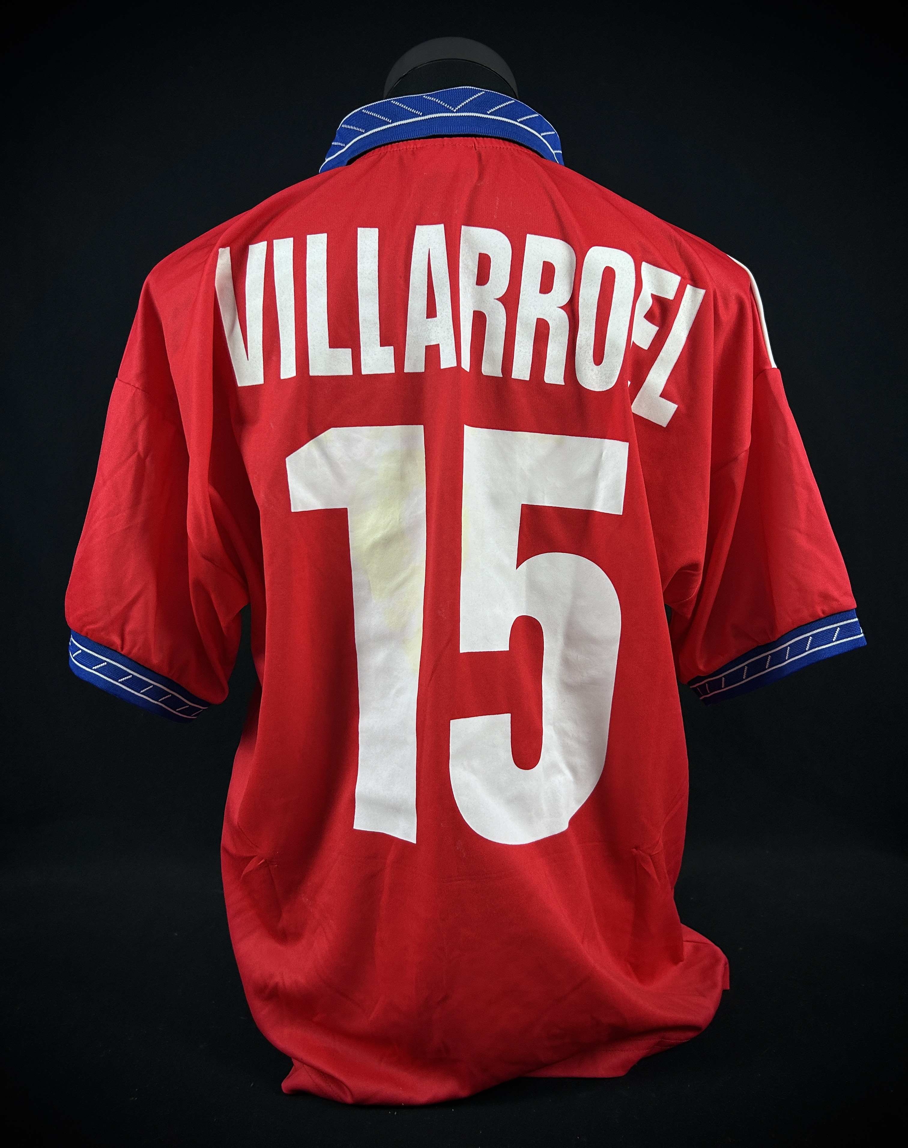 NOTE 2: A treasure for any chilean fans , a mitic jersey representing the come back from la roja to the world cups after 16 years. Jersey worn on pitch by Moisés Villarroel on June 17th vs Austria and gifted after tournament to his friend and teammate in Wanderers Reinaldo Navia as related by provenance. Villarroel payed until 67'.