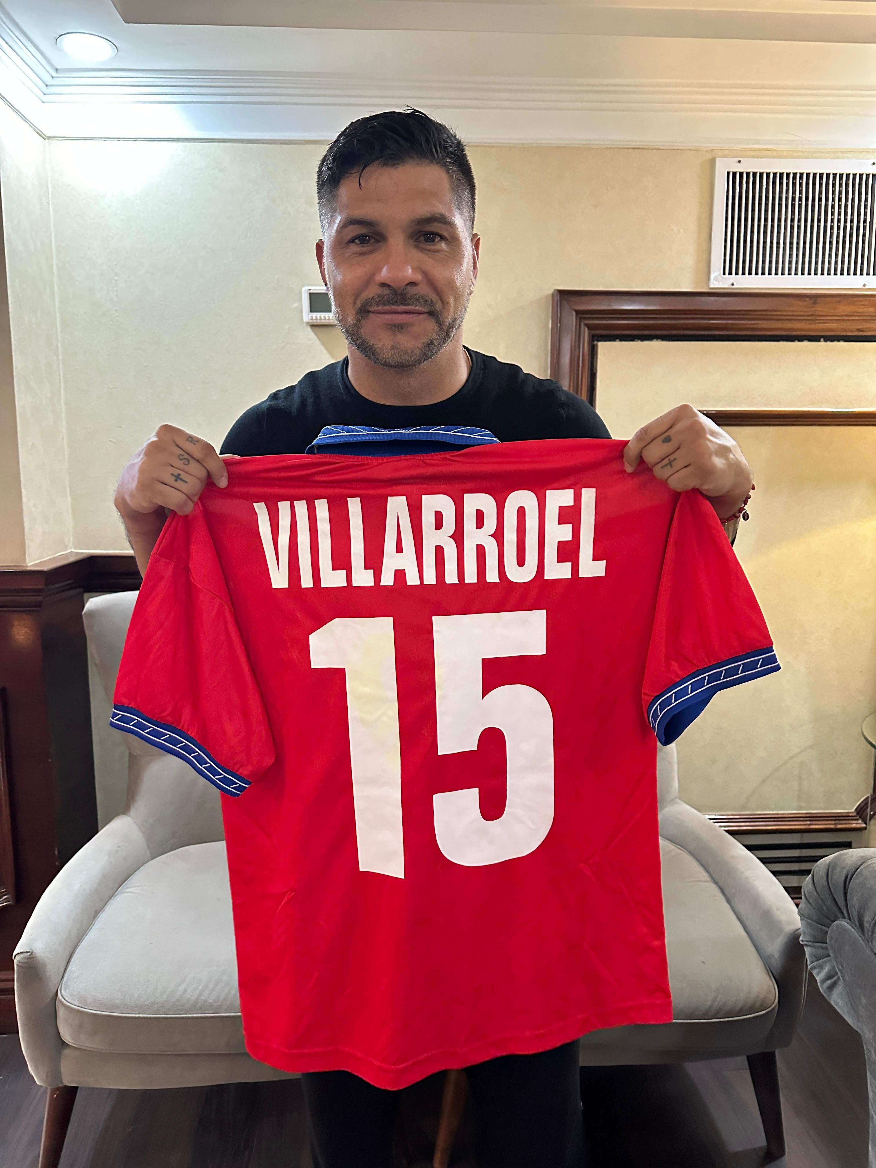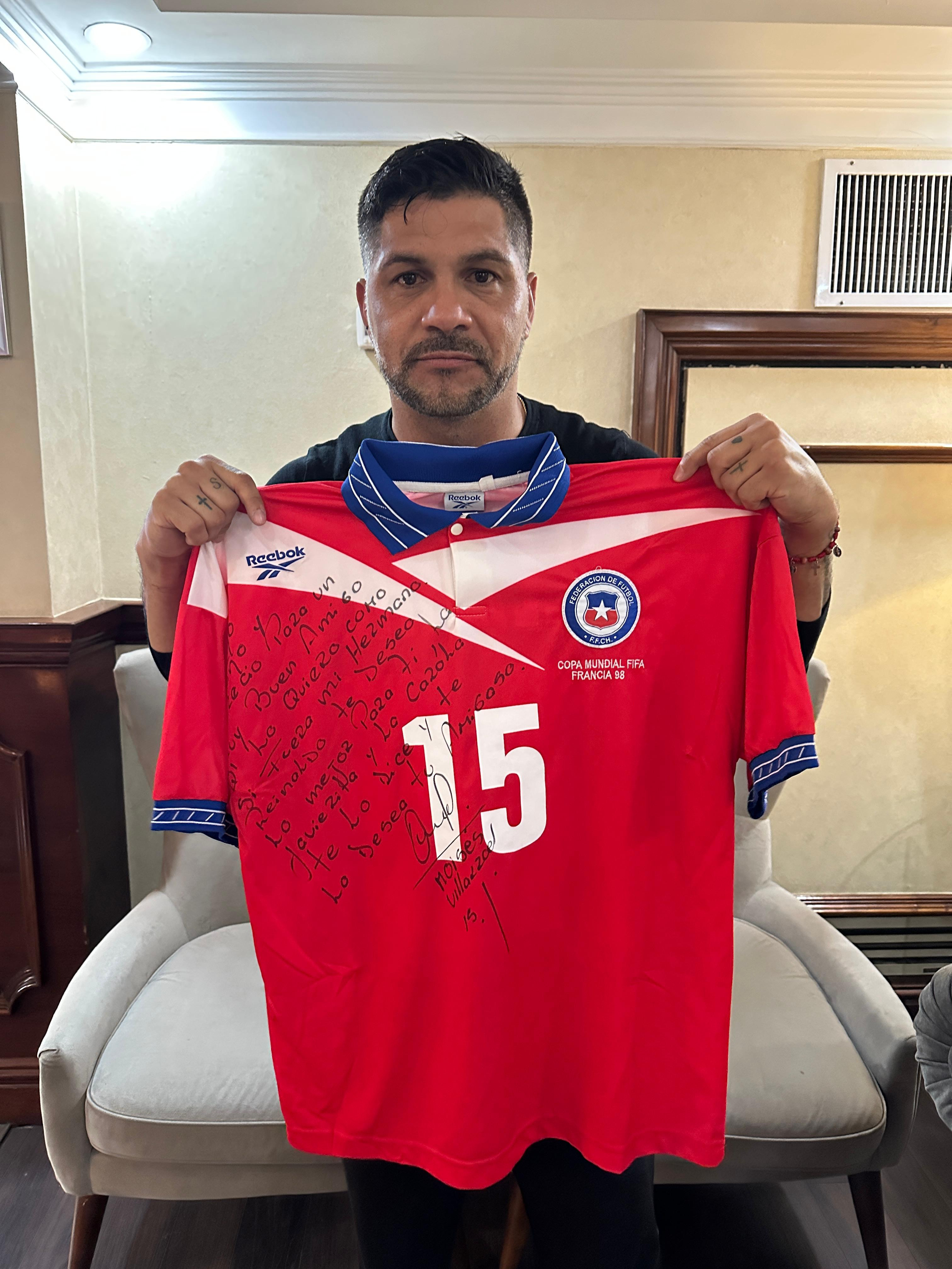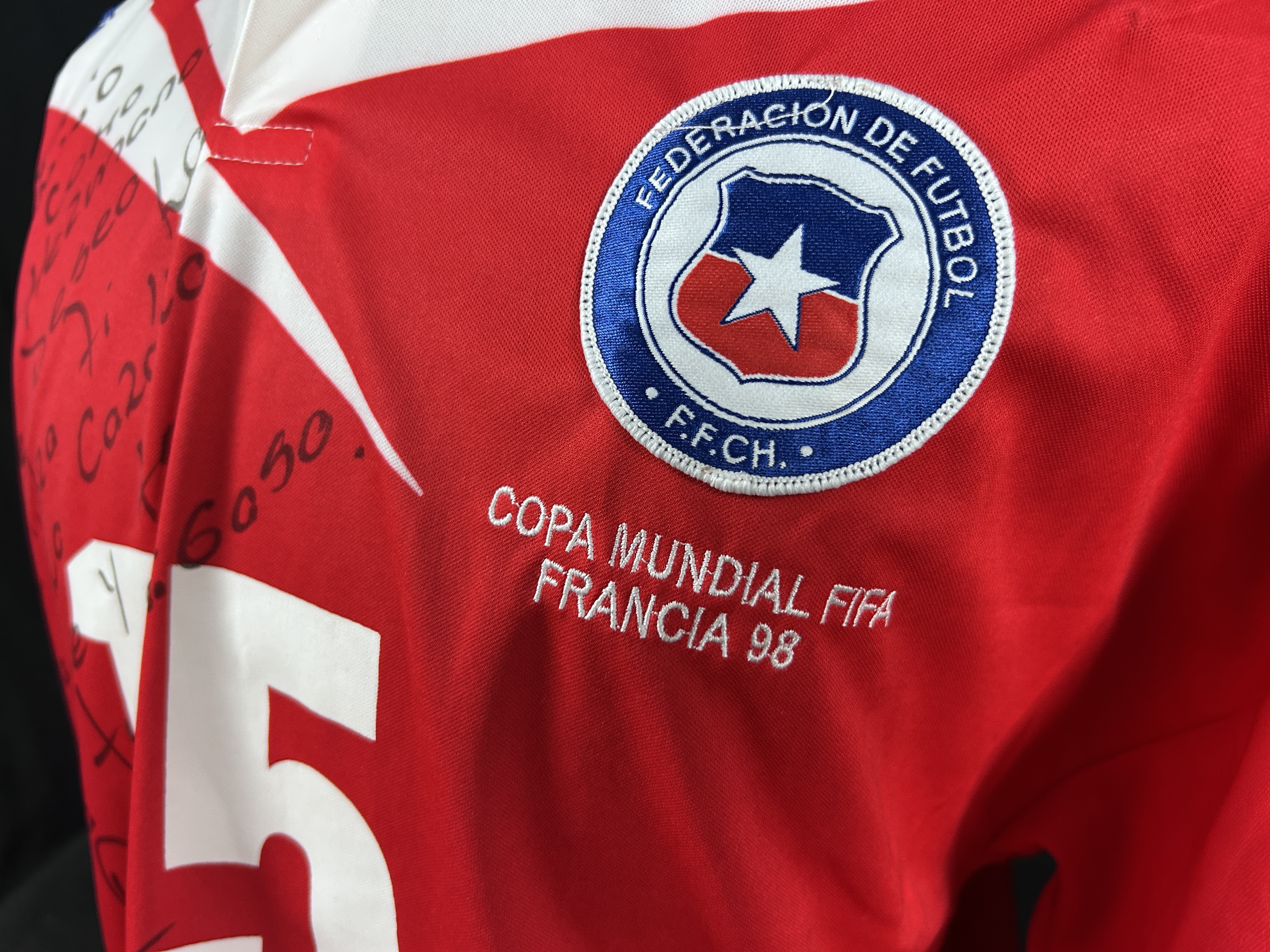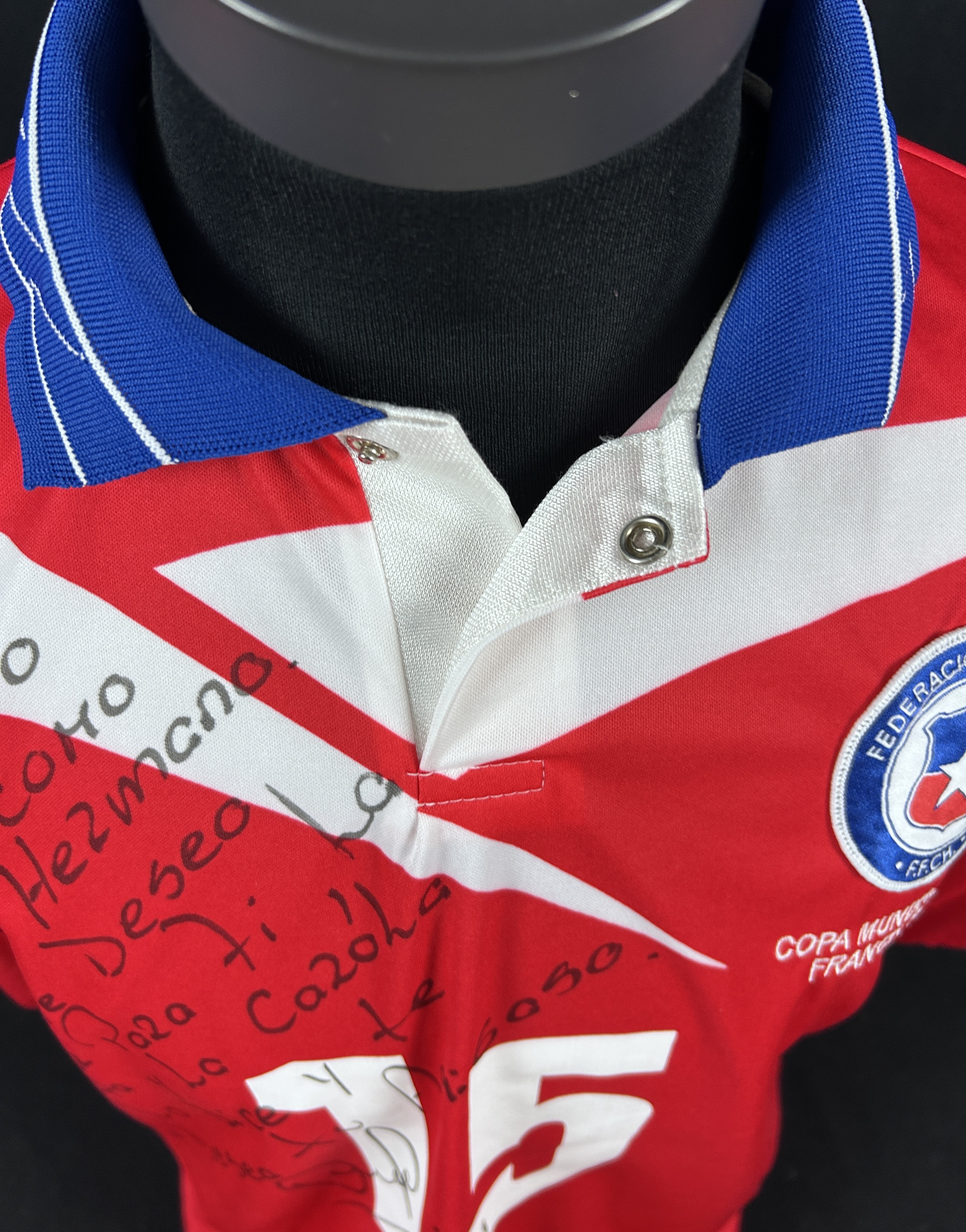 NOTE 2: A treasure for any chilean fans , a mitic jersey representing the come back from la roja to the world cups after 16 years. Jersey worn on pitch by Moisés Villarroel on June 17th vs Austria and gifted after tournament to his friend and teammate in Wanderers Reinaldo Navia as related by provenance. Villarroel payed until 67'.