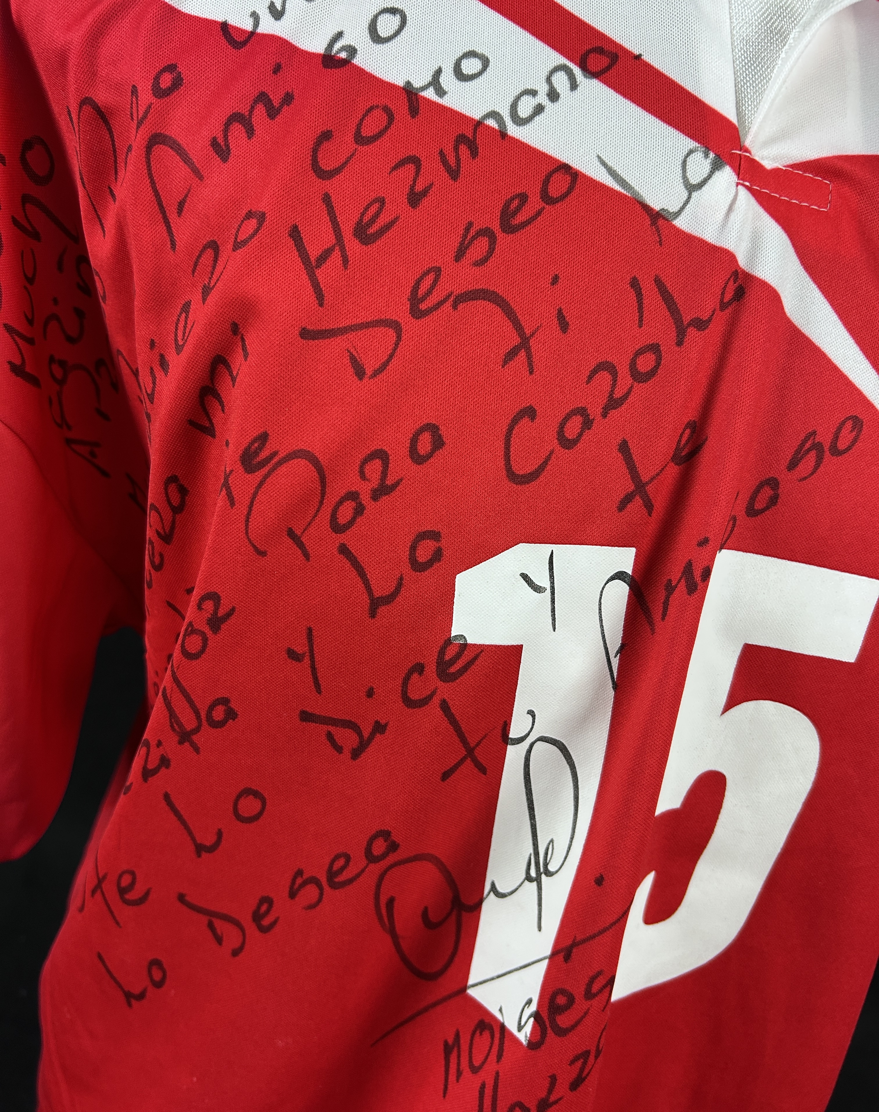 NOTE 4: FULL SIGNED ON FRONT. Jersey full signed and personalized with balck pen to Navia and family on front showing the close bond of affection between Villarroel and Navia.