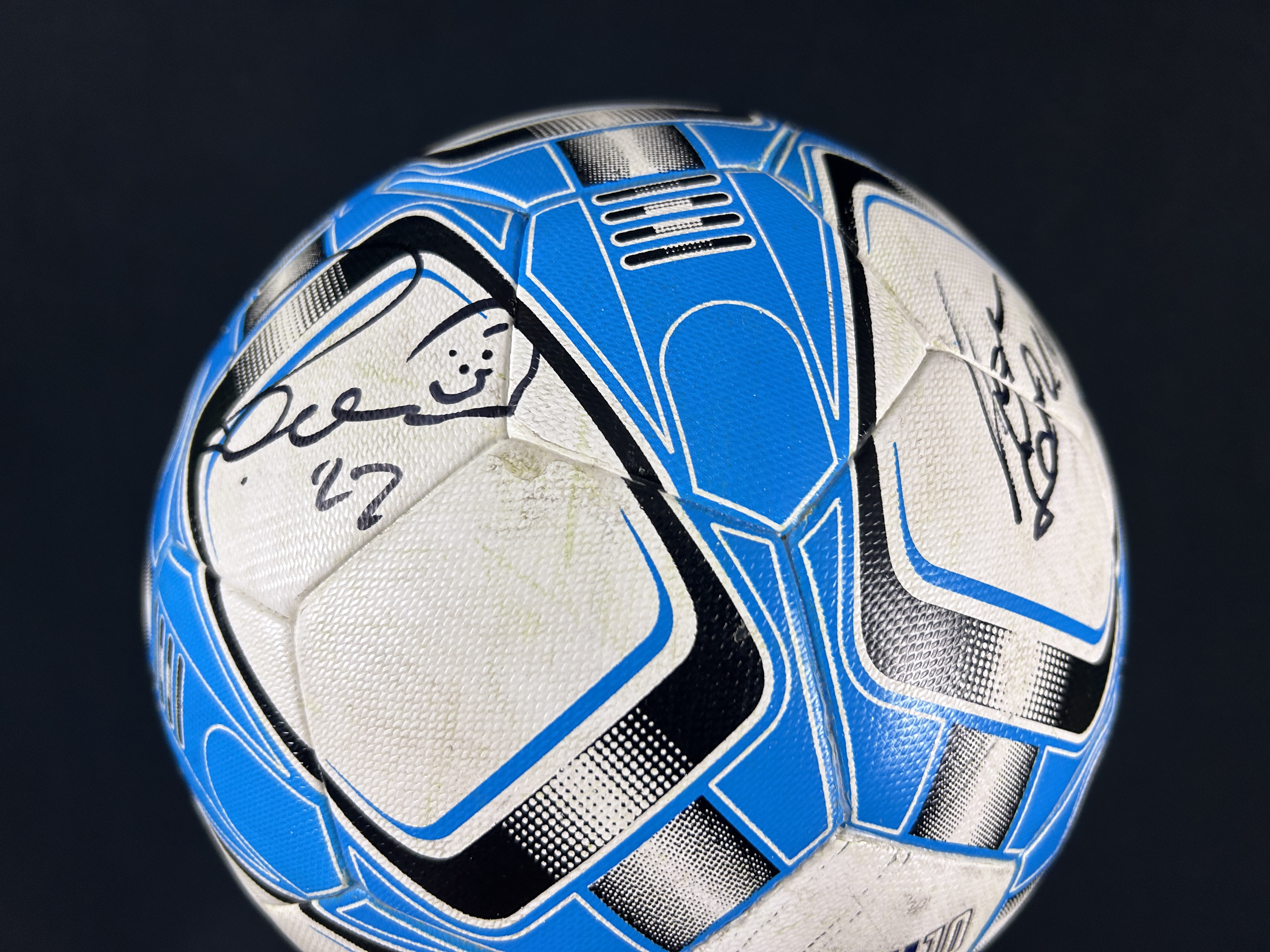 Firmada: Pelota firmada por Walter Montillo con dedicatoria especial "Recuerdo de mi despedida". Firma con lápiz permanente negro - Además firmada por las leyendas argentinas Juan Pablo Sorín y Ezequiel Lavezzi.
