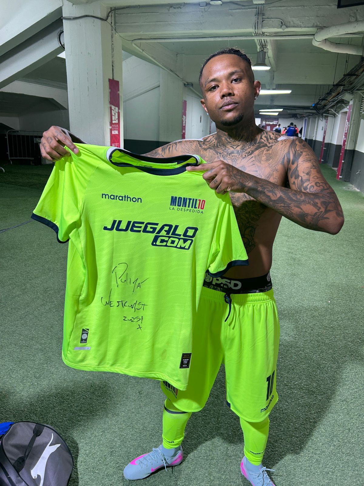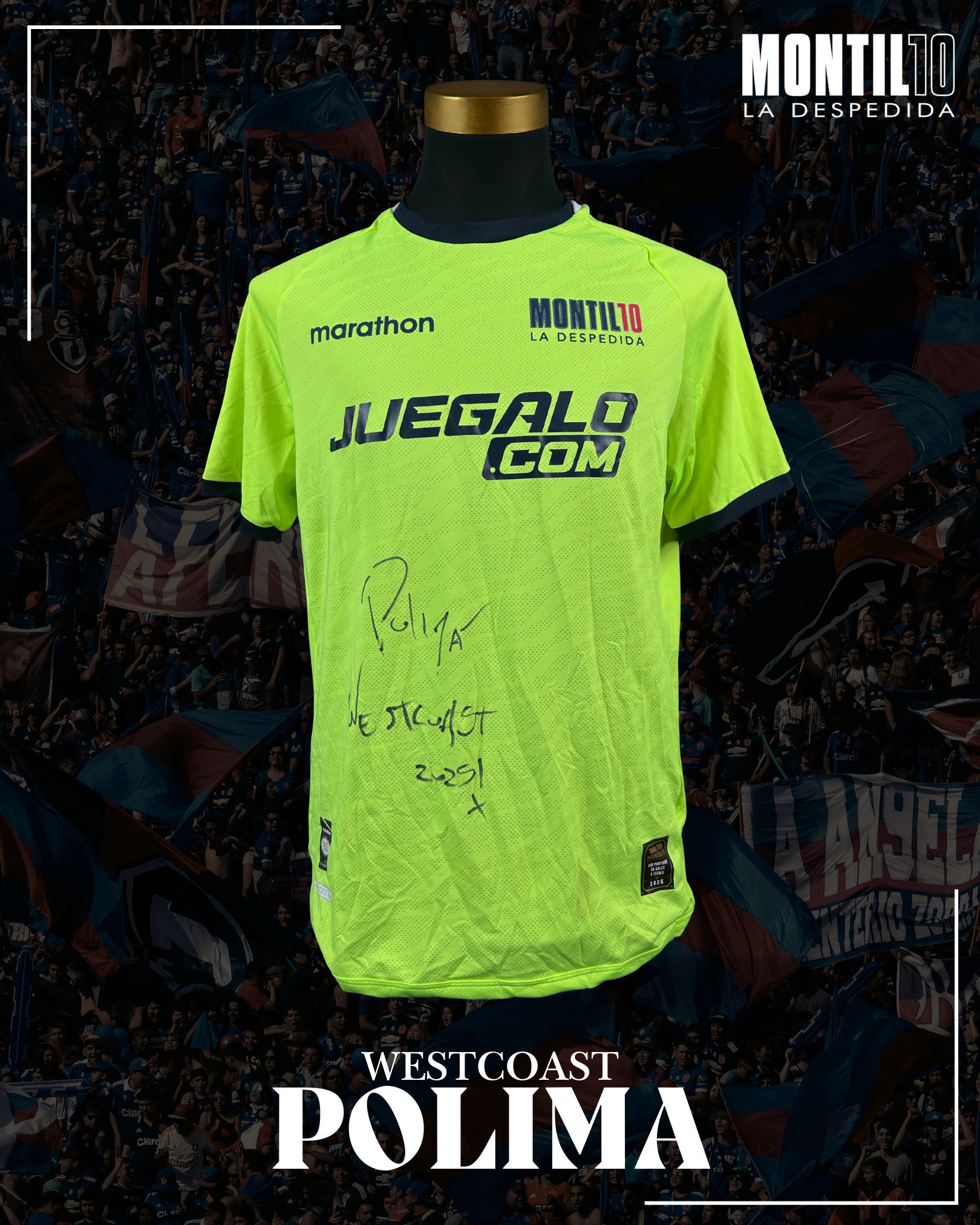 Descripción Lote: CAMISETA TRANSPIRADA Y USADO POR ARTISTA URBANO CHILENO POLIMÁ WESTCOAST EN CANCHA DURANTE EL SEGUNDO TIEMPO DEL PARTIDO HOMENAJE "MONTILLO-LA DESPEDIDA" EL 16 DE DICIEMBRE 2025 .