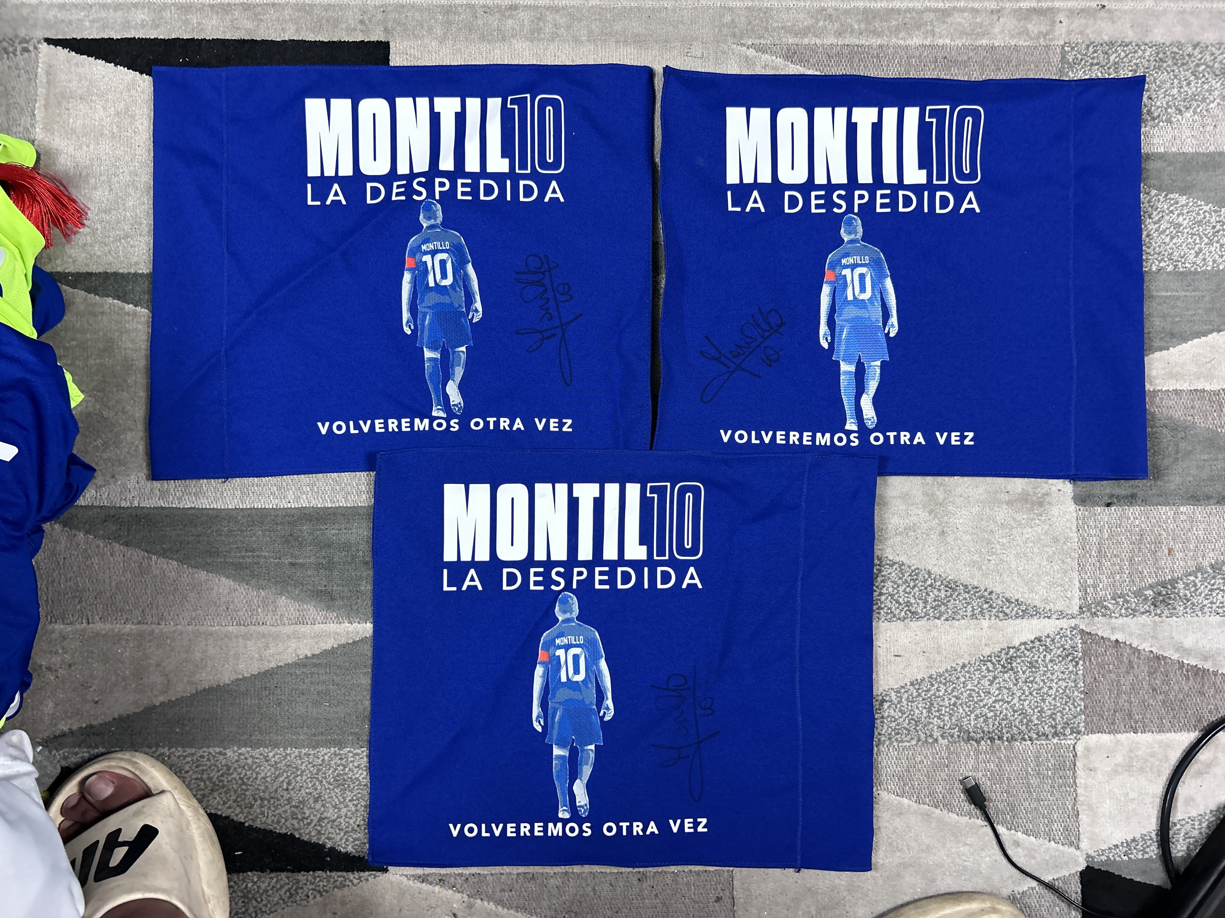 Firmada: 3 Banderas firmadas por el jugador Waltwer Montillo en el camarín. Firma con lápiz permanente negro .