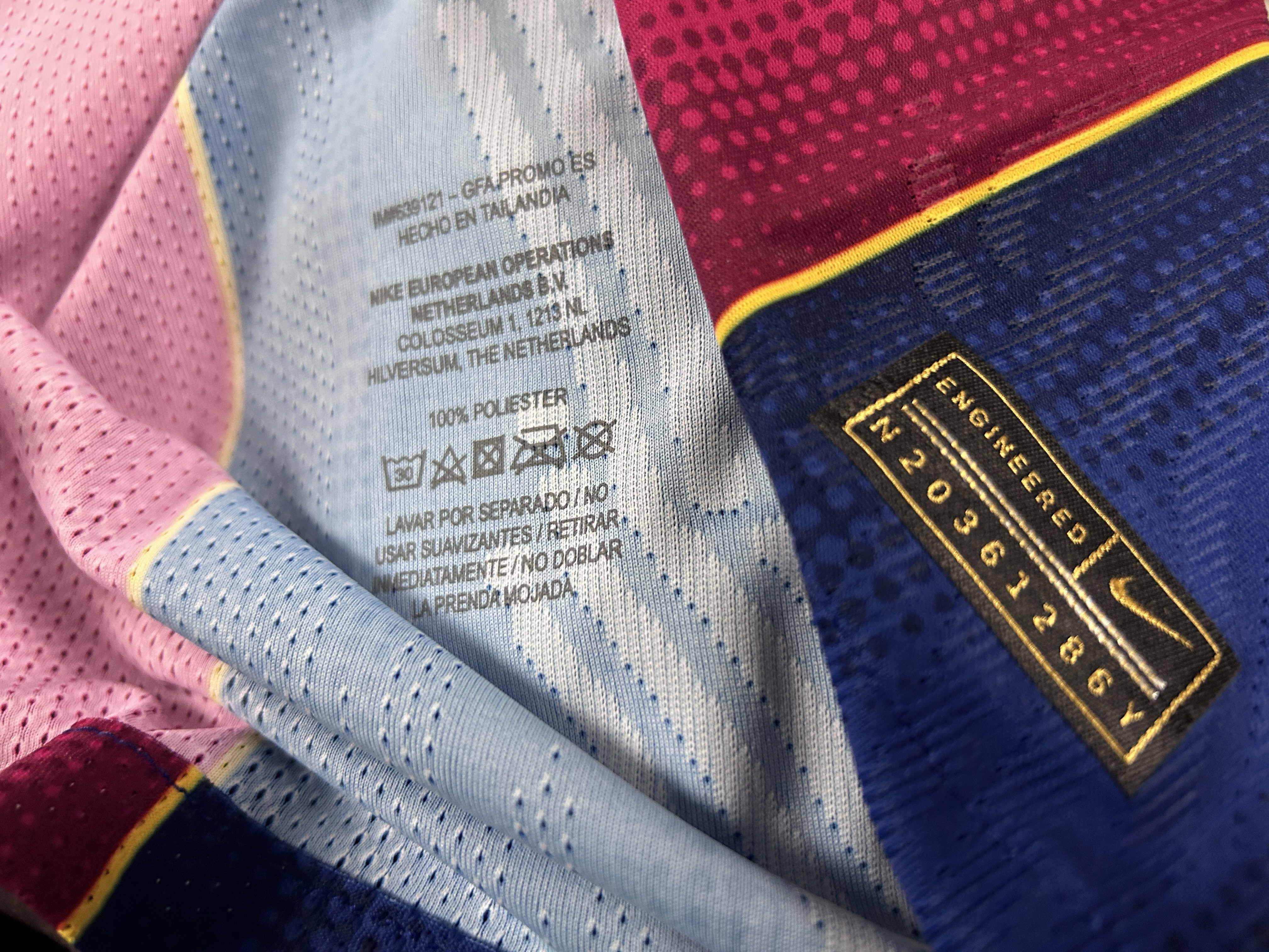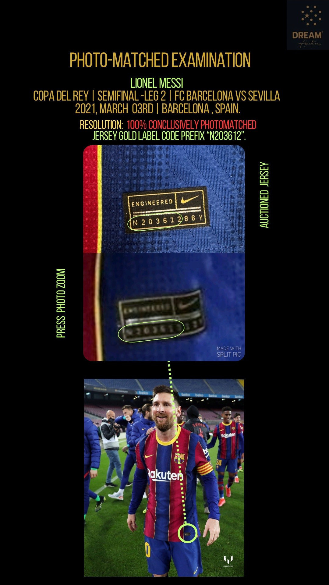 PHOTOMATCHED GOLD LABEL CODE PREFIX. Golden label serial number with photomatched first six digits the same as those worn on the field, which indicates that the shirt is indeed one of those generated from the Barcelona kitroom and worn or issued on those dates against Sevilla for King Cup. (N203612)