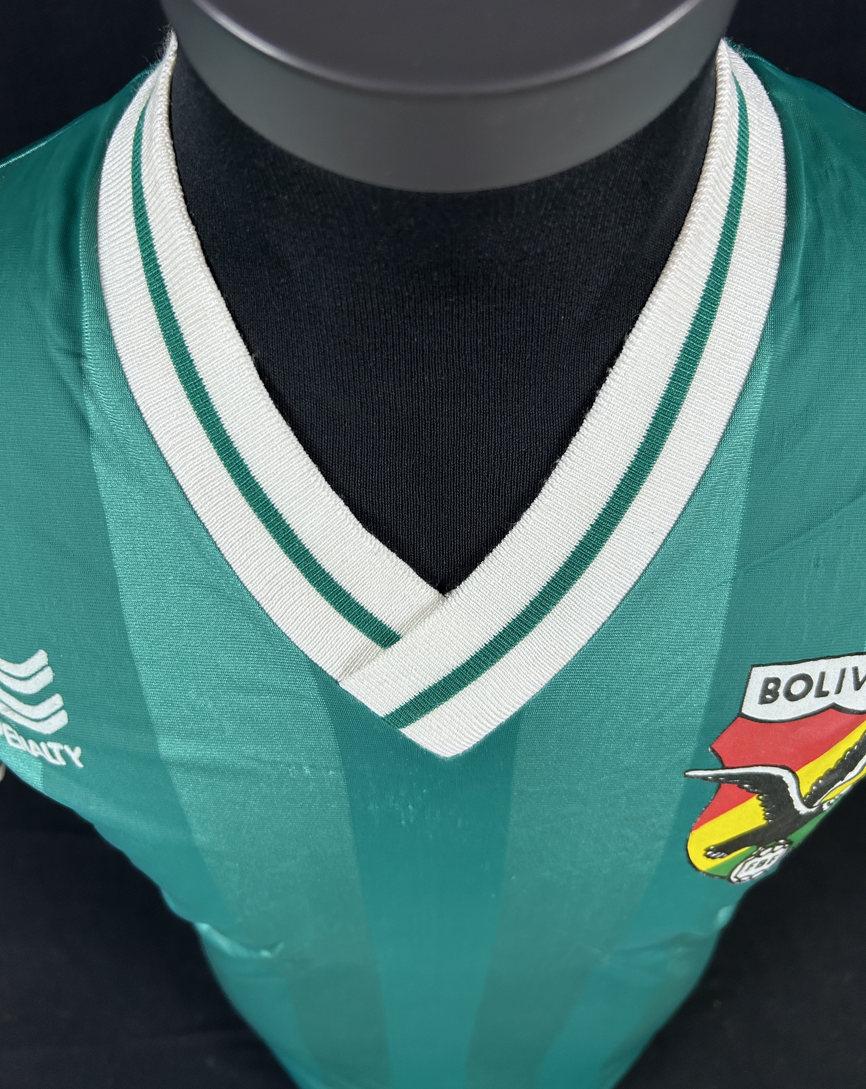 NOTE 1: Exclusive beatiful home design worn during the 1986 world cup qualifiers and kept it after a match in the tournament , as related by Milton Melgar securately this auctioned jersey was the one worn against Paraguay on May 26,1985 in the 1-1 during the debut match.