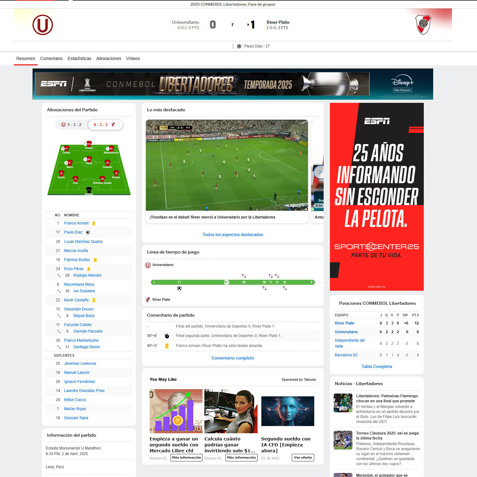 Game: UNIVERSITARIO vs RIVER PLATE (0-1)