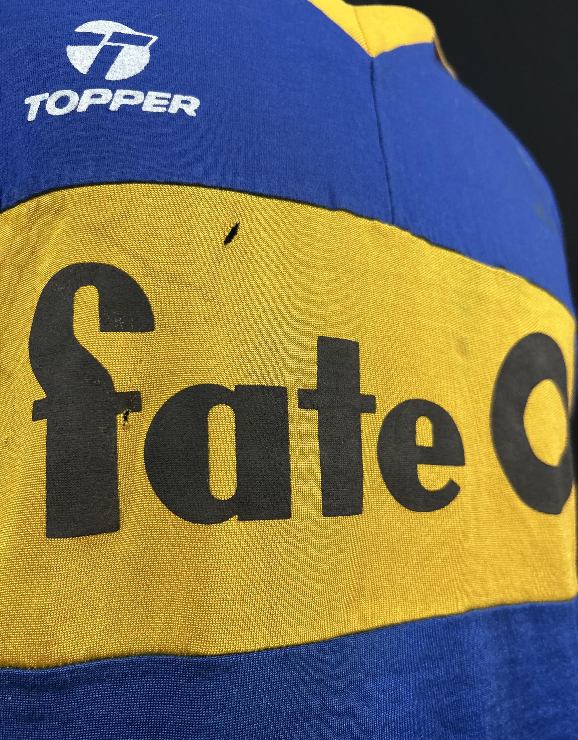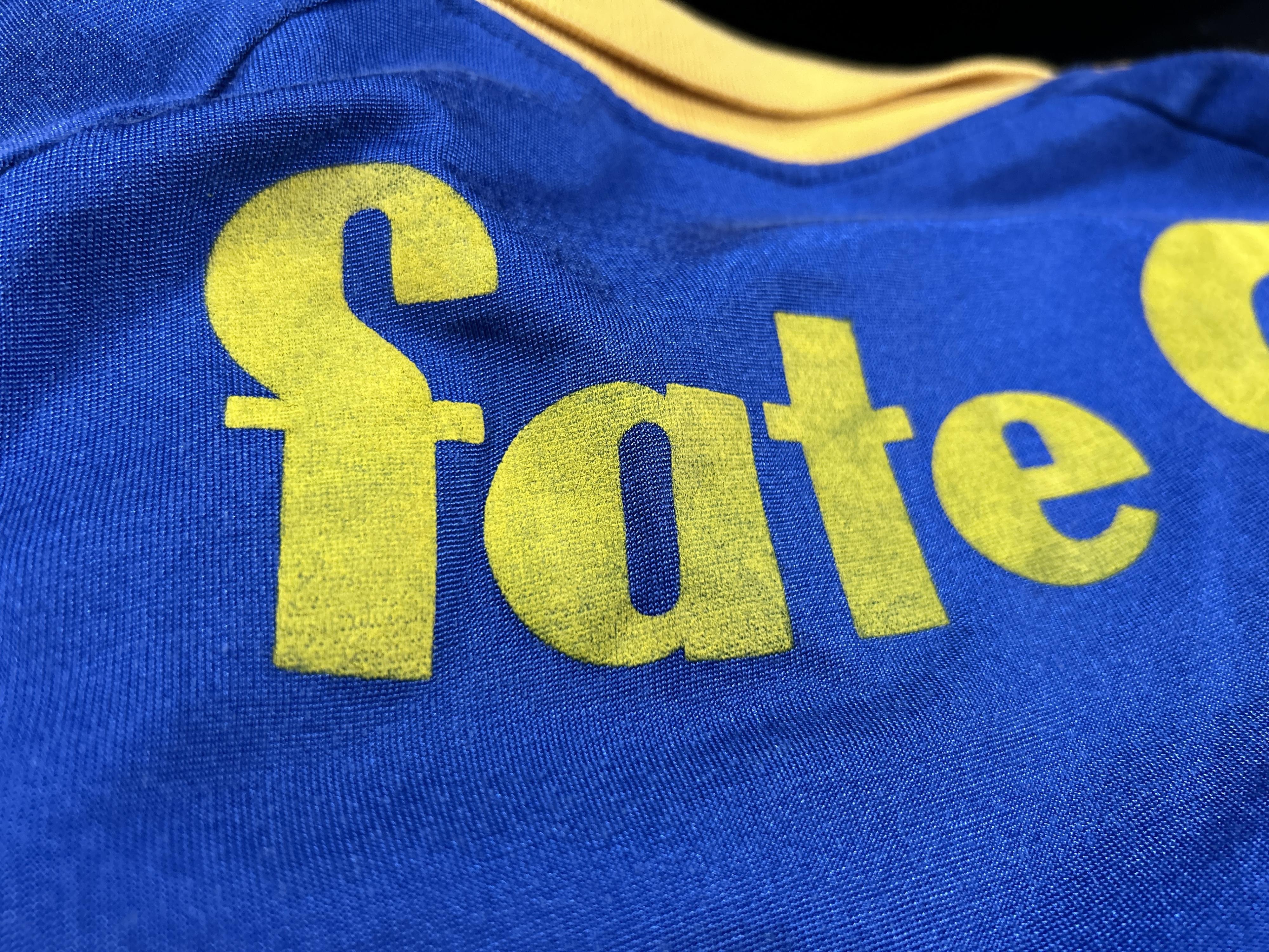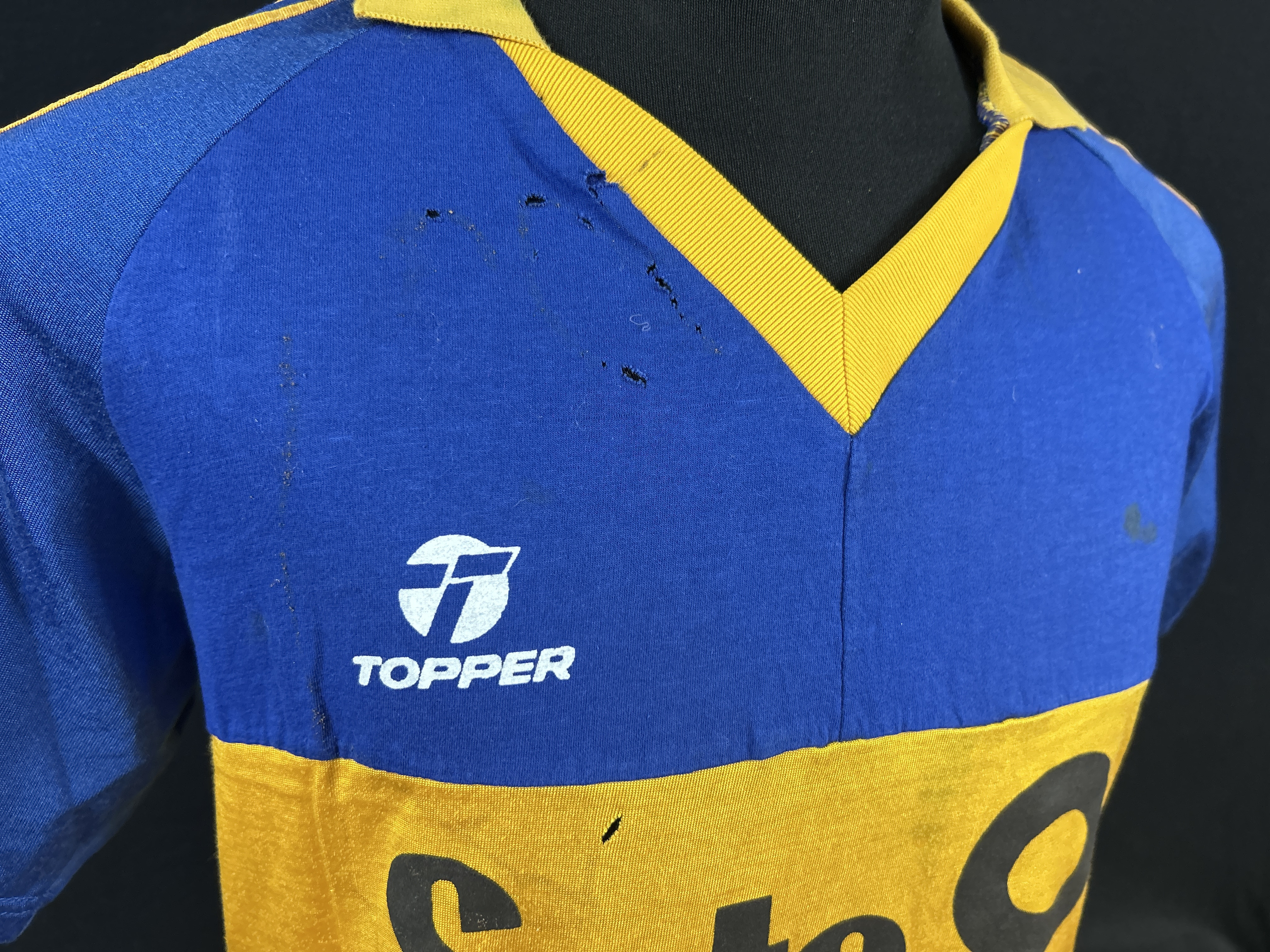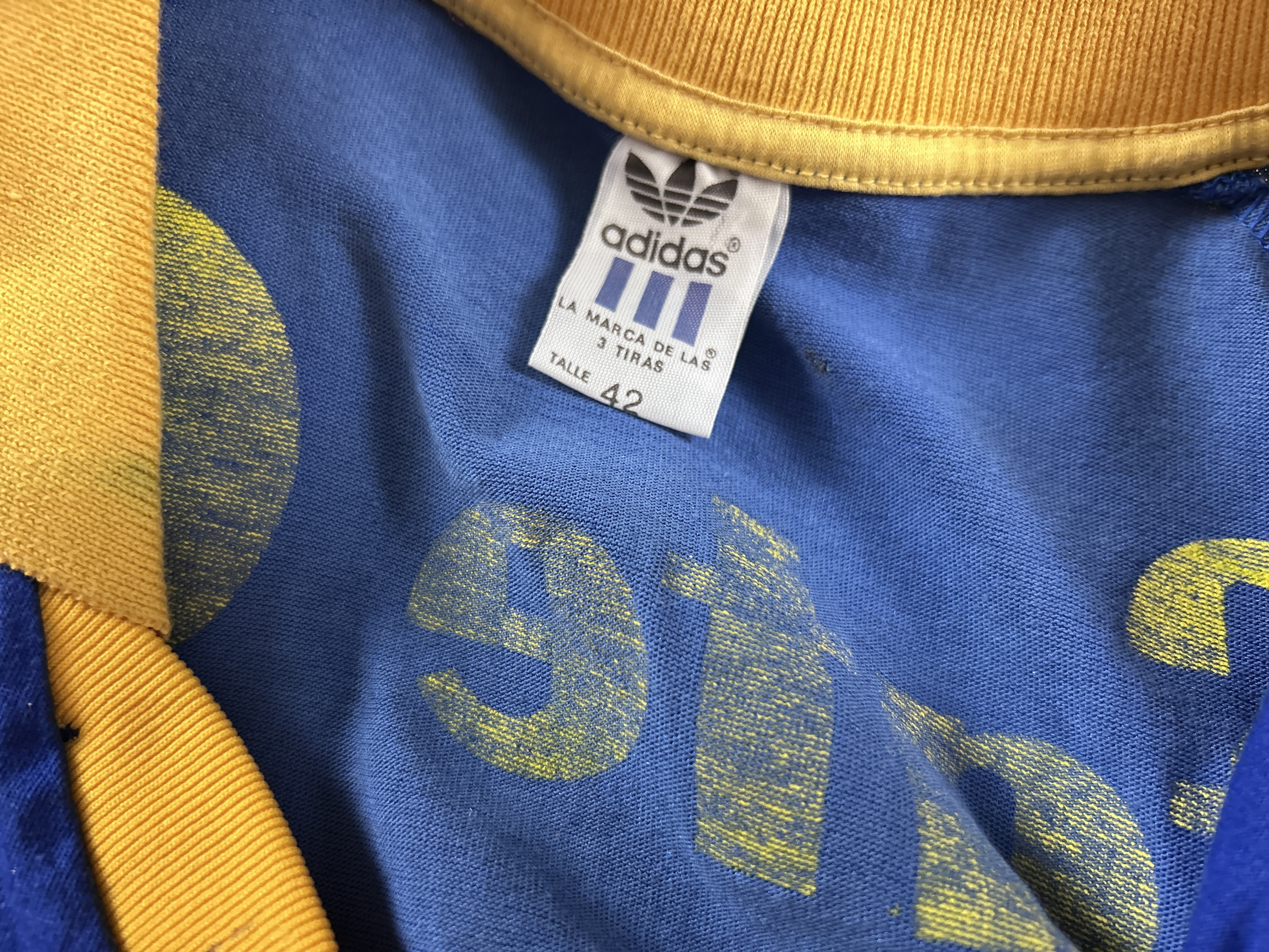 NOTE 1: TOPPER BRAND WITH ADIDAS JERSEY. Absolutely rare jersey part of the Milton Melgar collection. As related by player jersey given from the club to him during his first matches at the end of 1985 and first weeks of 1986. Rare Topper jersey with Adidas label, so very rare and segurely sought after by collectors. Jersey with front blue fabric different than adidas jersey probably associated to the Topper logo , but with Adidas white label sewn on collar.