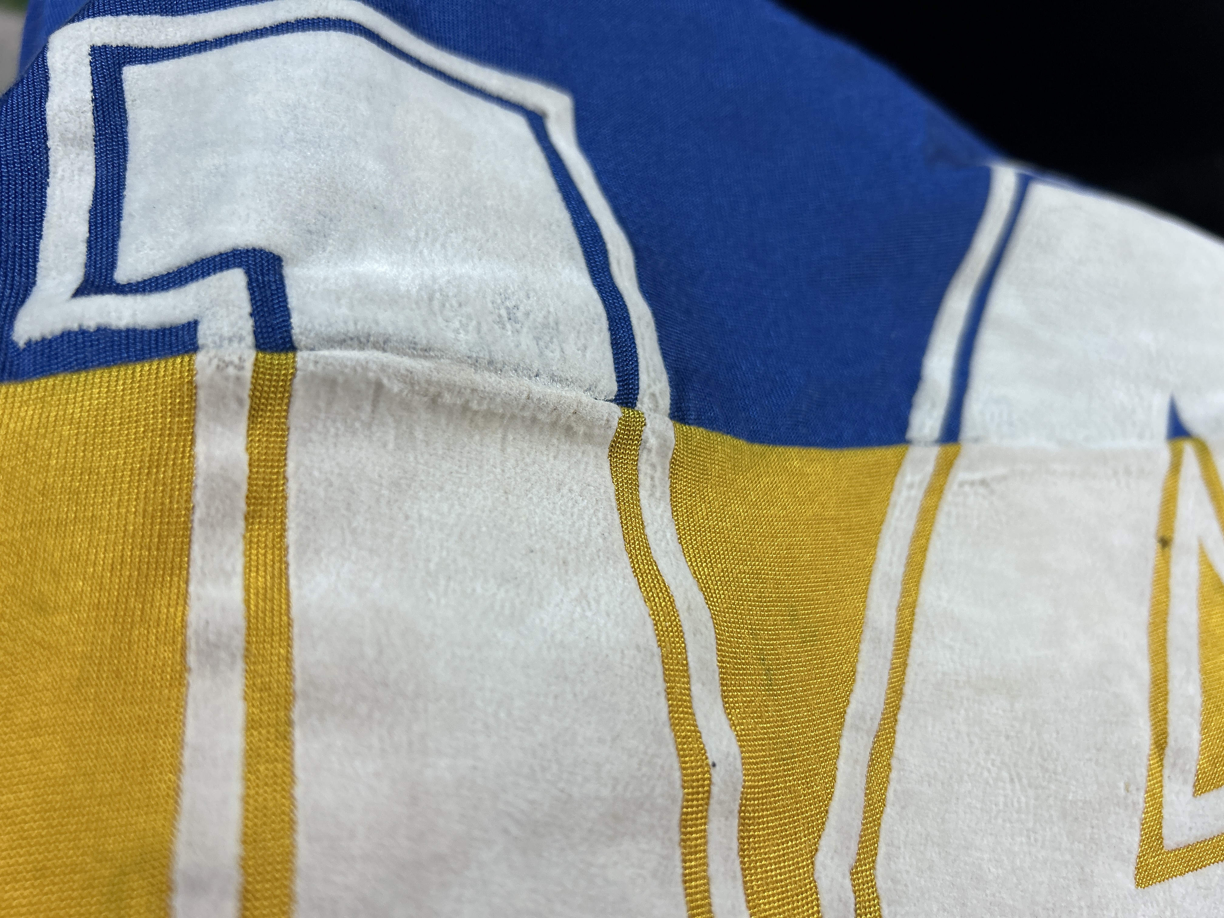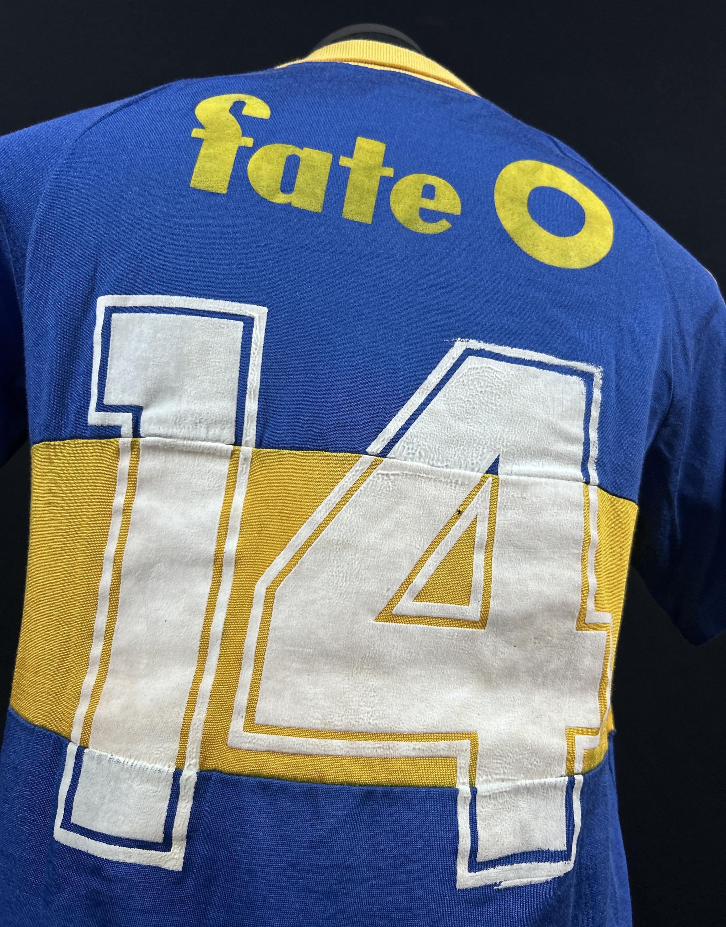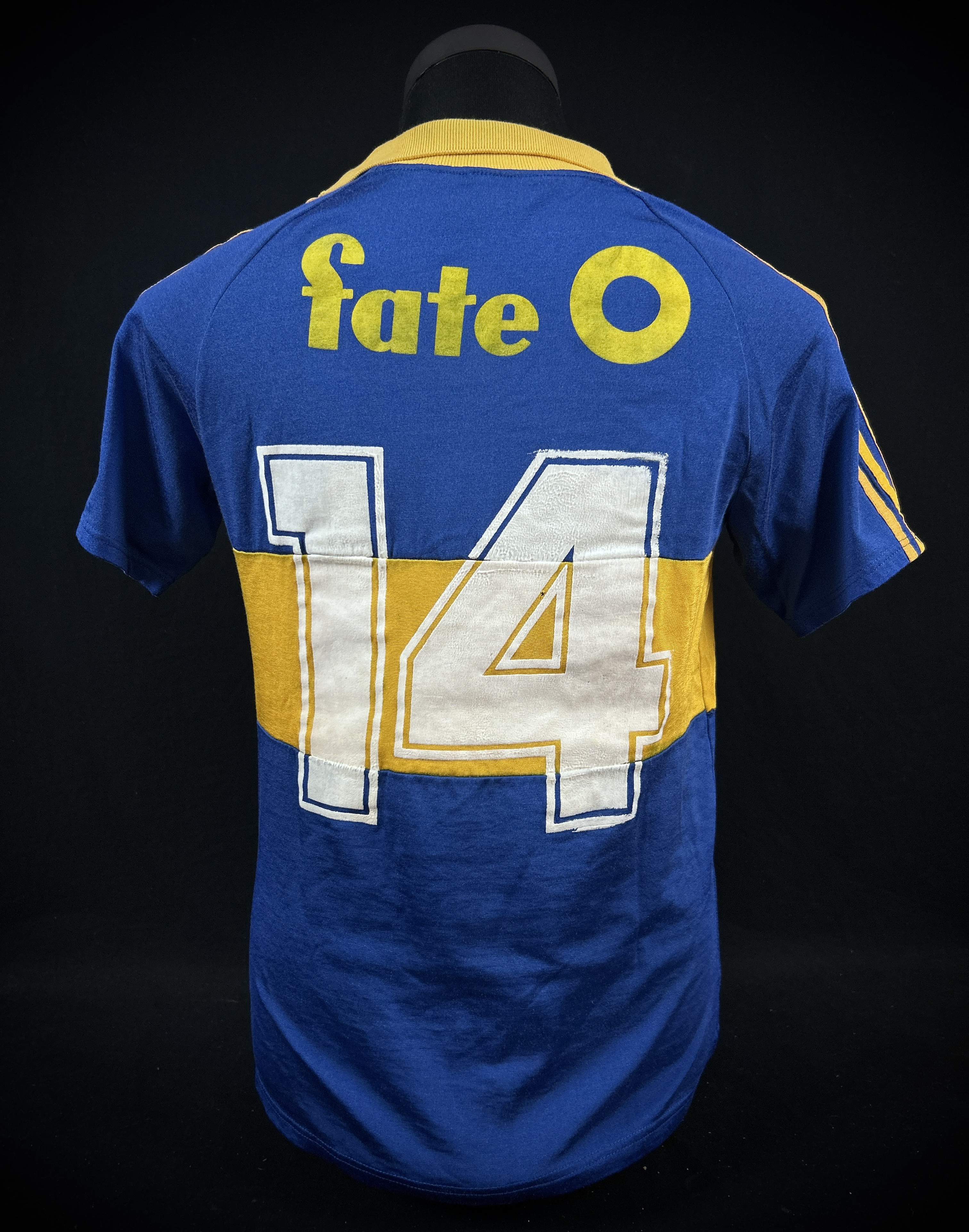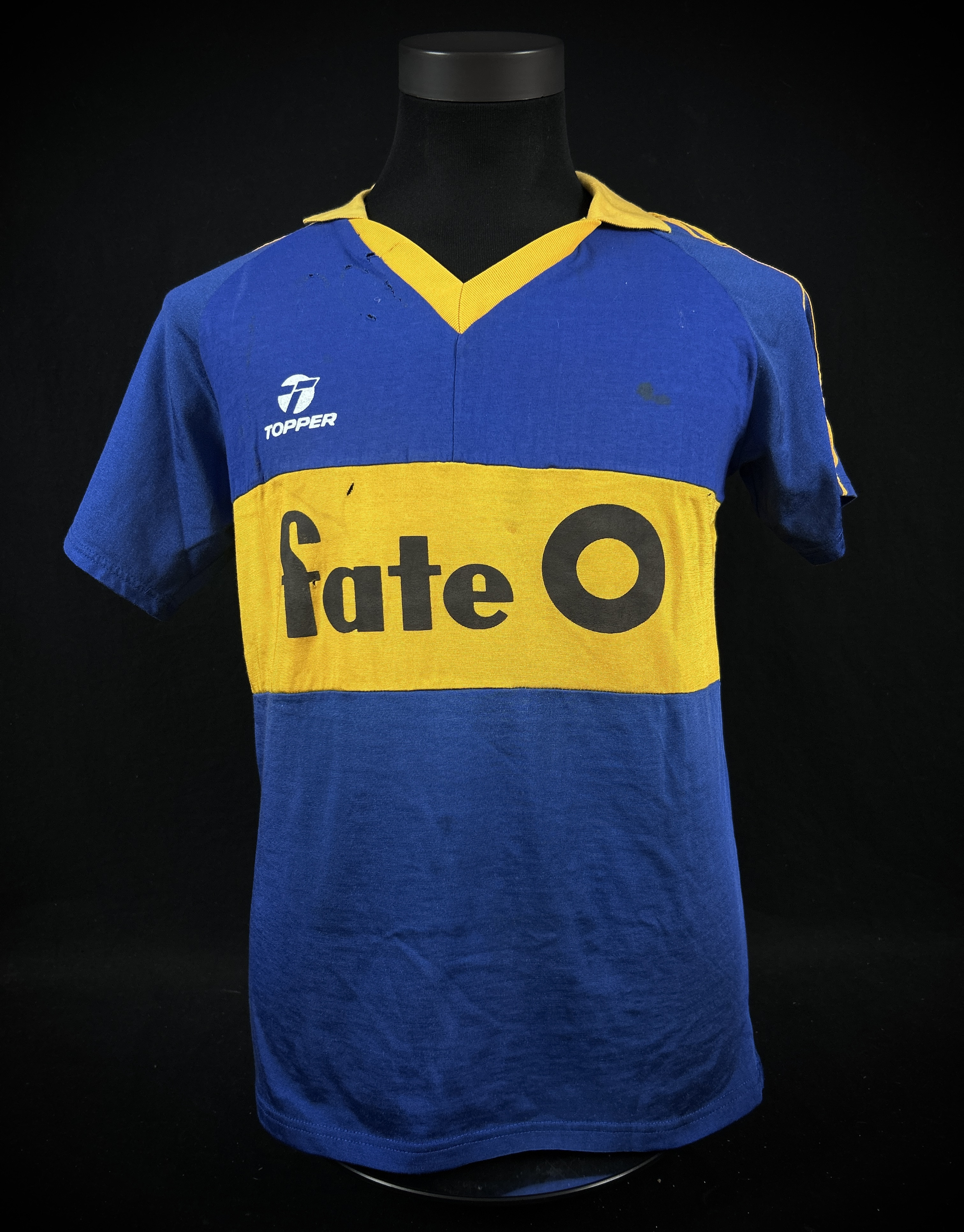NOTE 1: TOPPER BRAND WITH ADIDAS JERSEY. Absolutely rare jersey part of the Milton Melgar collection. As related by player jersey given from the club to him during his first matches at the end of 1985 and first weeks of 1986. Rare Topper jersey with Adidas label, so very rare and segurely sought after by collectors. Jersey with front blue fabric different than adidas jersey probably associated to the Topper logo , but with Adidas white label sewn on collar.