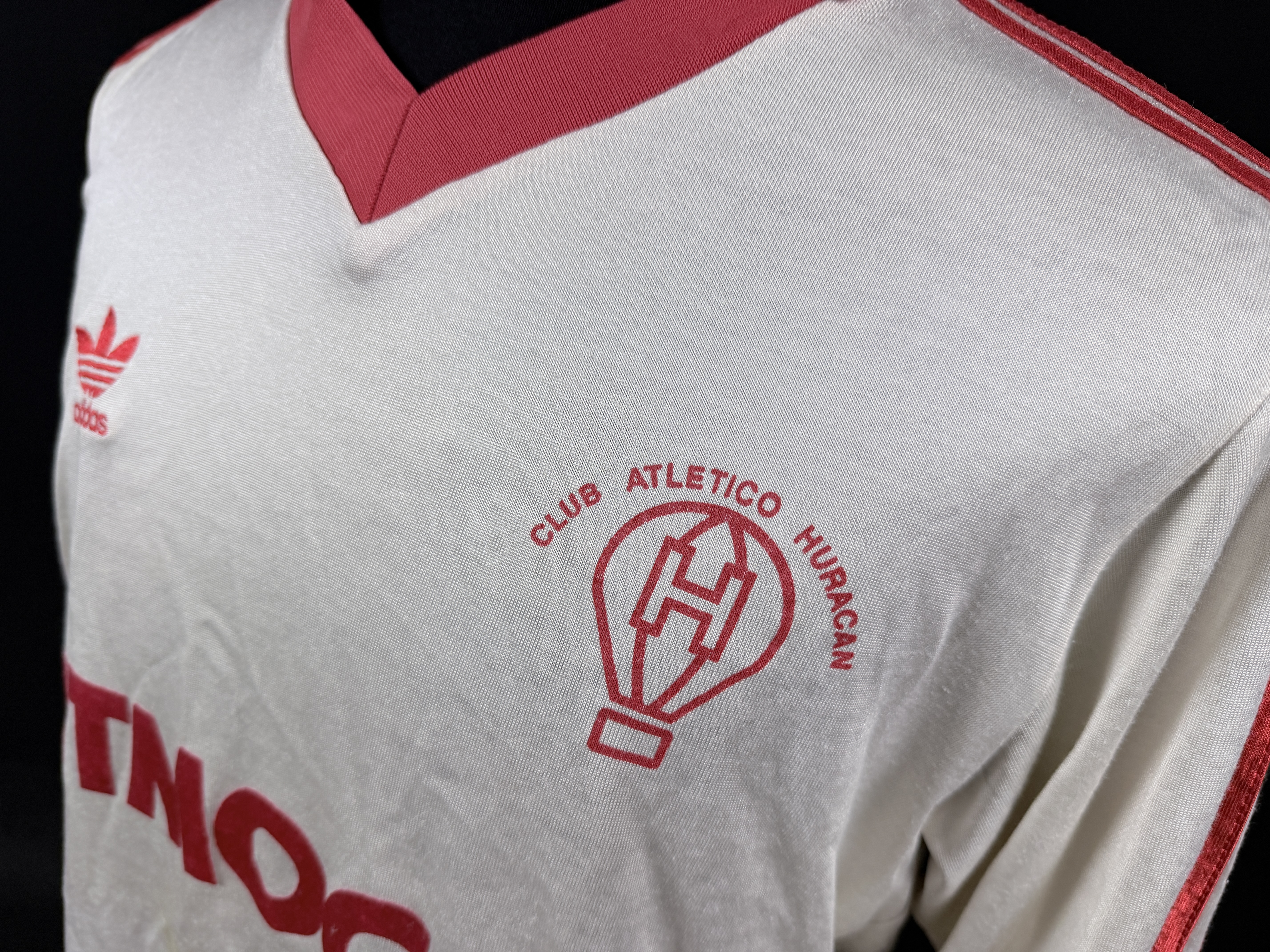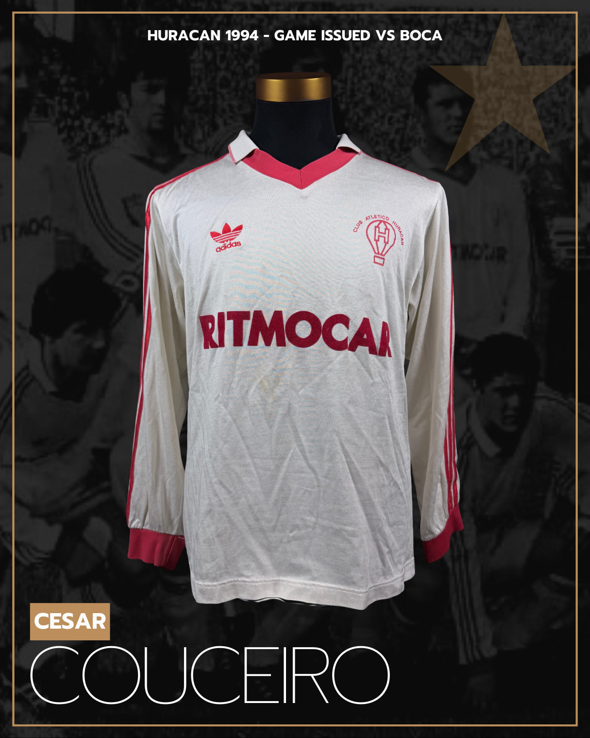 NOTE 1: Jersey issued to be worn on pitch on April 03rd, 1994 by César Couceiro and swapped after the match with "Polillita" Da Silva in an unforgettable season for Huracán. Couceiro worn short sleeve that day.