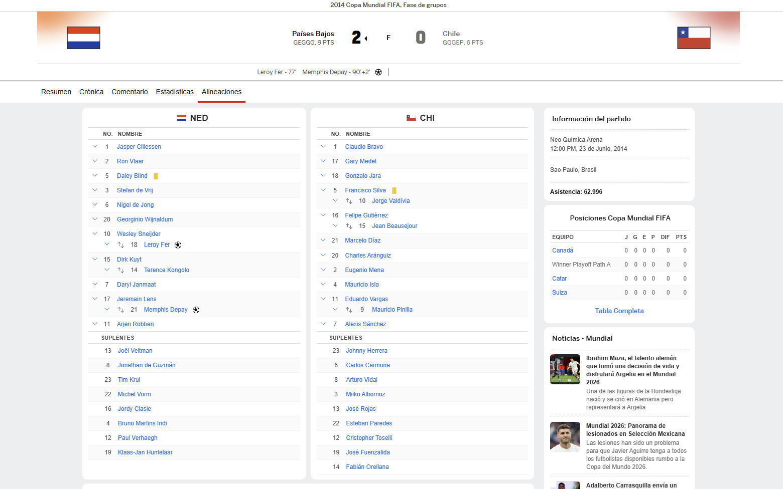 Game: NETHERLANDS vs CHILE (2-0)