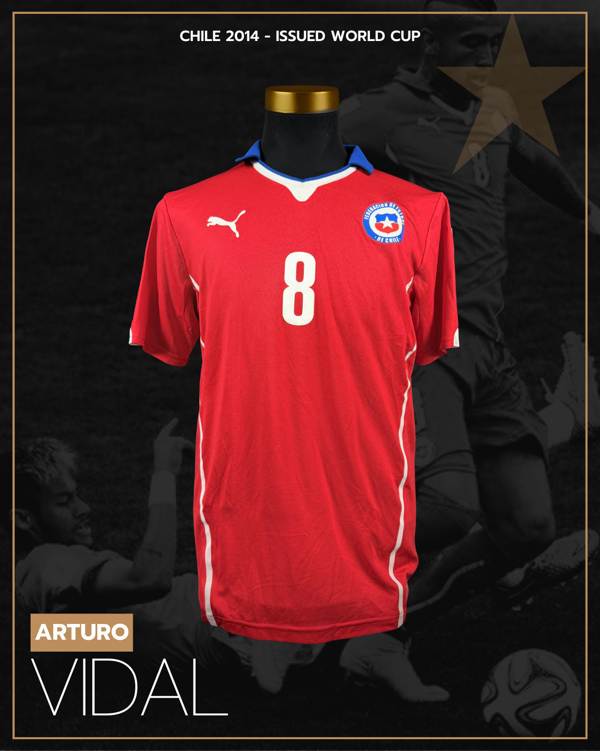 NOTE 1: "KING" IN THE WORLD CUP. A unique opportunity to own a World Cup treasure from who, for many, is the best player in Chilean history. King Arturo Vidal has been a star of world football for the last 20 years, and this jersey represents one of his best periods with the Chilean national team, when despite a severe injury, he reached the World Cup and led the Chilean team to defeat the world champion Spain, and leave Brazil on its knees in an electrifying penalty shootout in Belo Horizonte.
