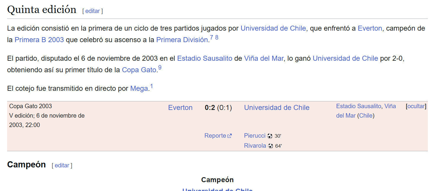 NOTE 2: COPA GATO. The edition was the first of a three-match series played by Universidad de Chile against Everton, the 2003 Primera B champions who had just been promoted to the Primera División.The match, played on November 6, 2003, at the Estadio Sausalito in Viña del Mar, was won by Universidad de Chile 2-0, thus securing their first Copa Gato title.