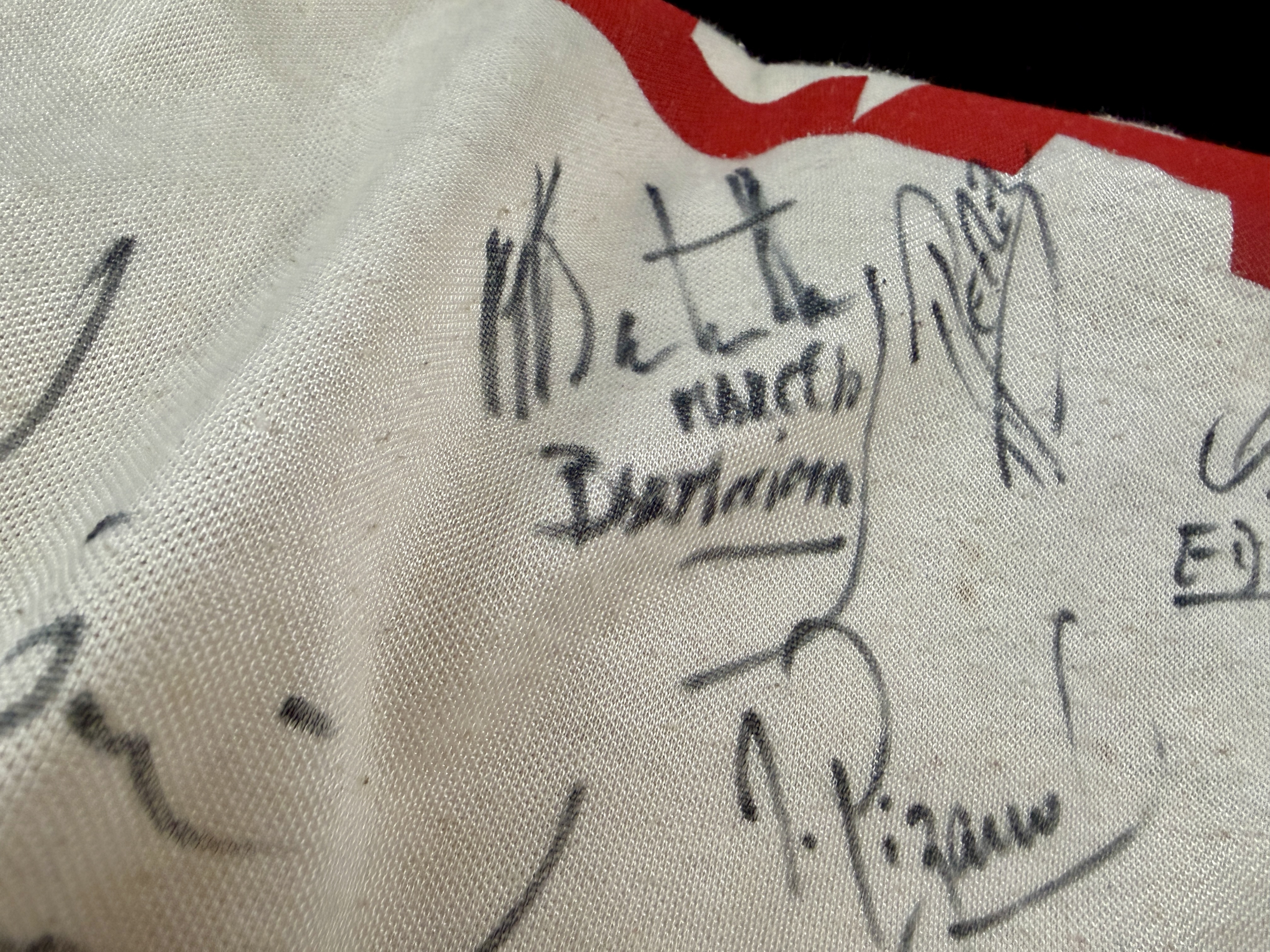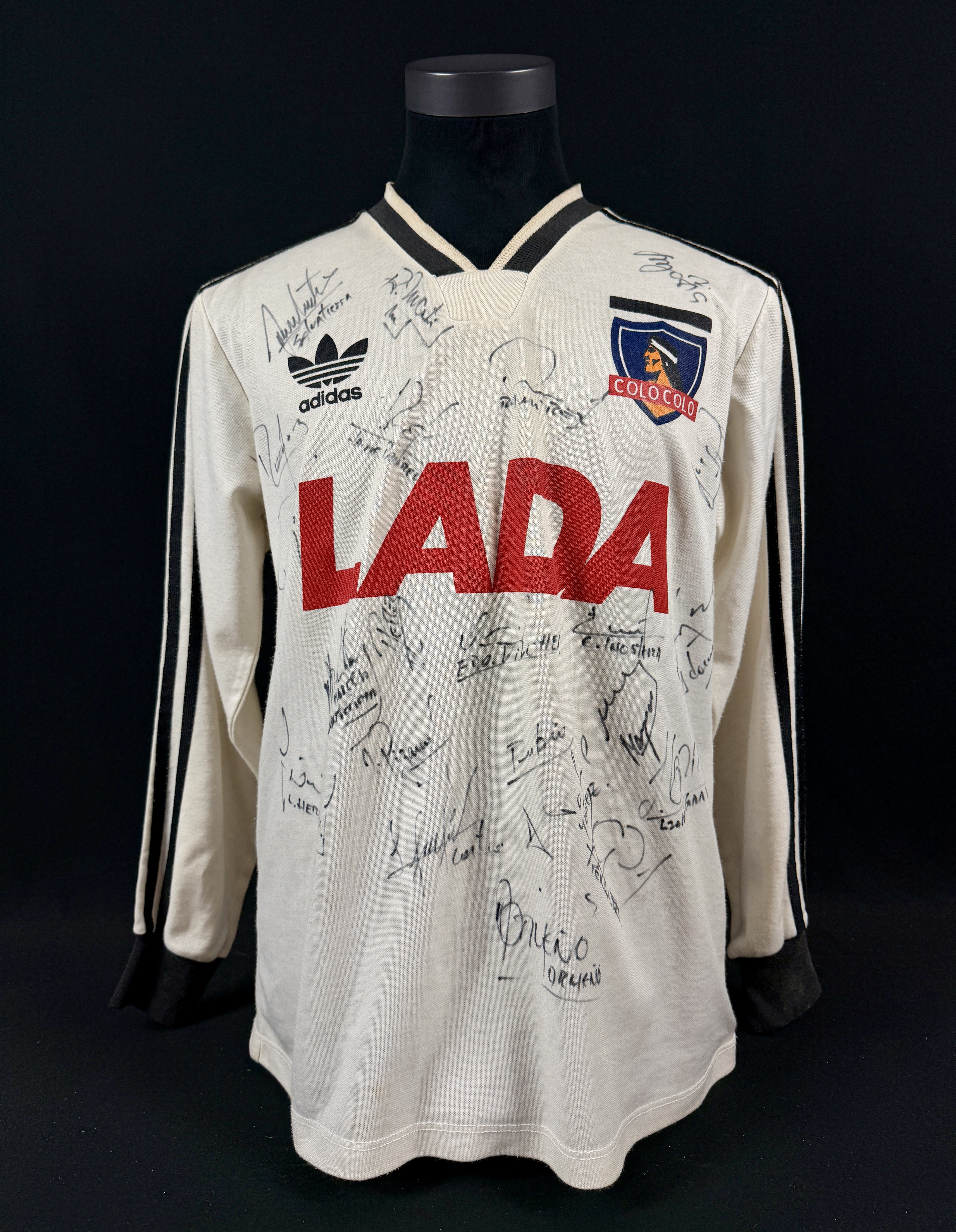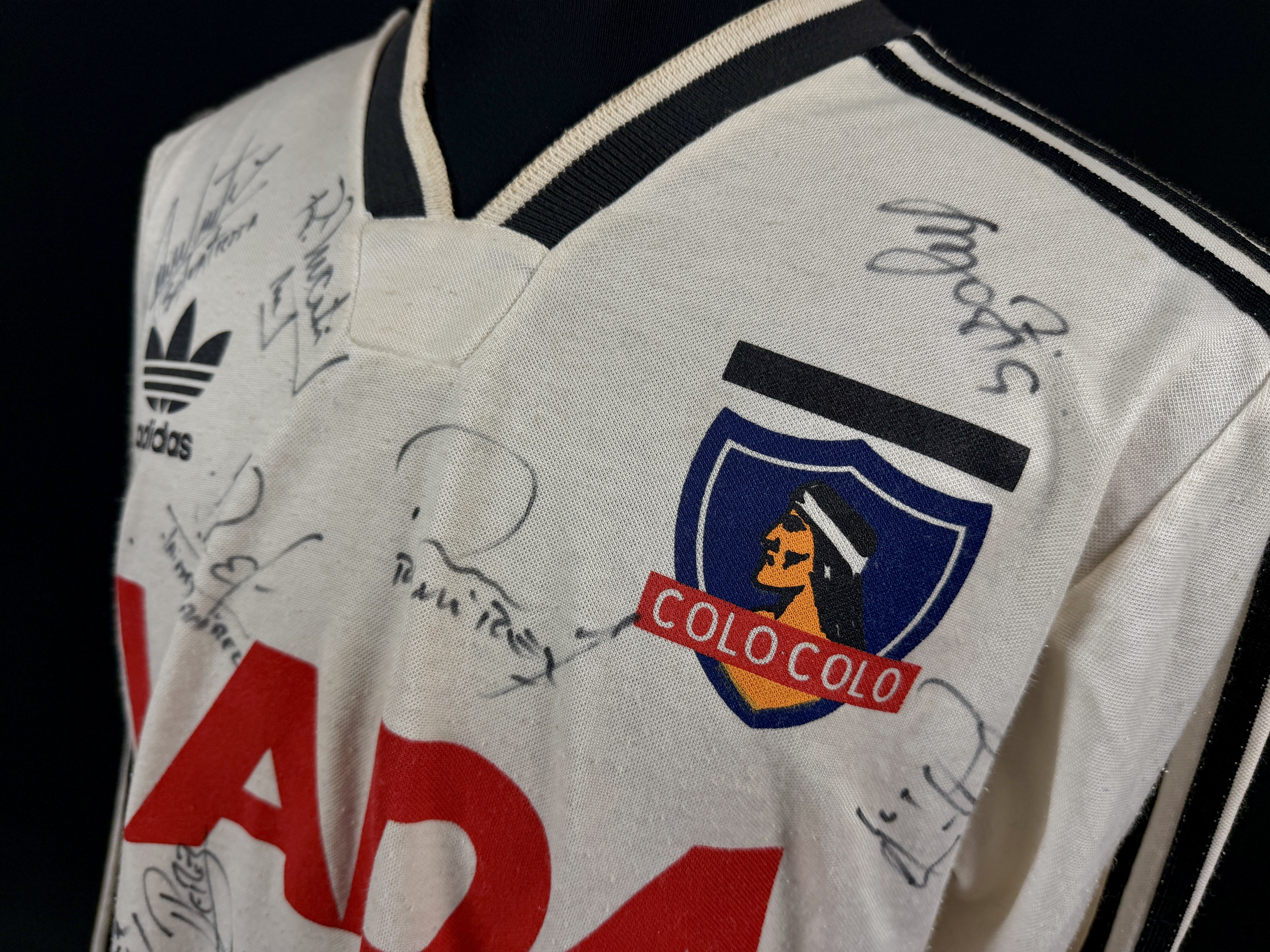 SIGNED BY CHAMPIONS.UNIQUE Jersey Signed on front for all team players 1991 and some of 1992. Vintage signature inlcuding Miguel Ramirez, Daniel Morón, Rubén Martinez, Marcelo Barticciotto, Jaime Pizarro, Patricio Yañez, Lizardo Garrido, Leonel Herrera, Luis Pérez, Javier Margas, Juan Carlos Peralta, Eddio Inostroza and even Mirko Jozic himself!!