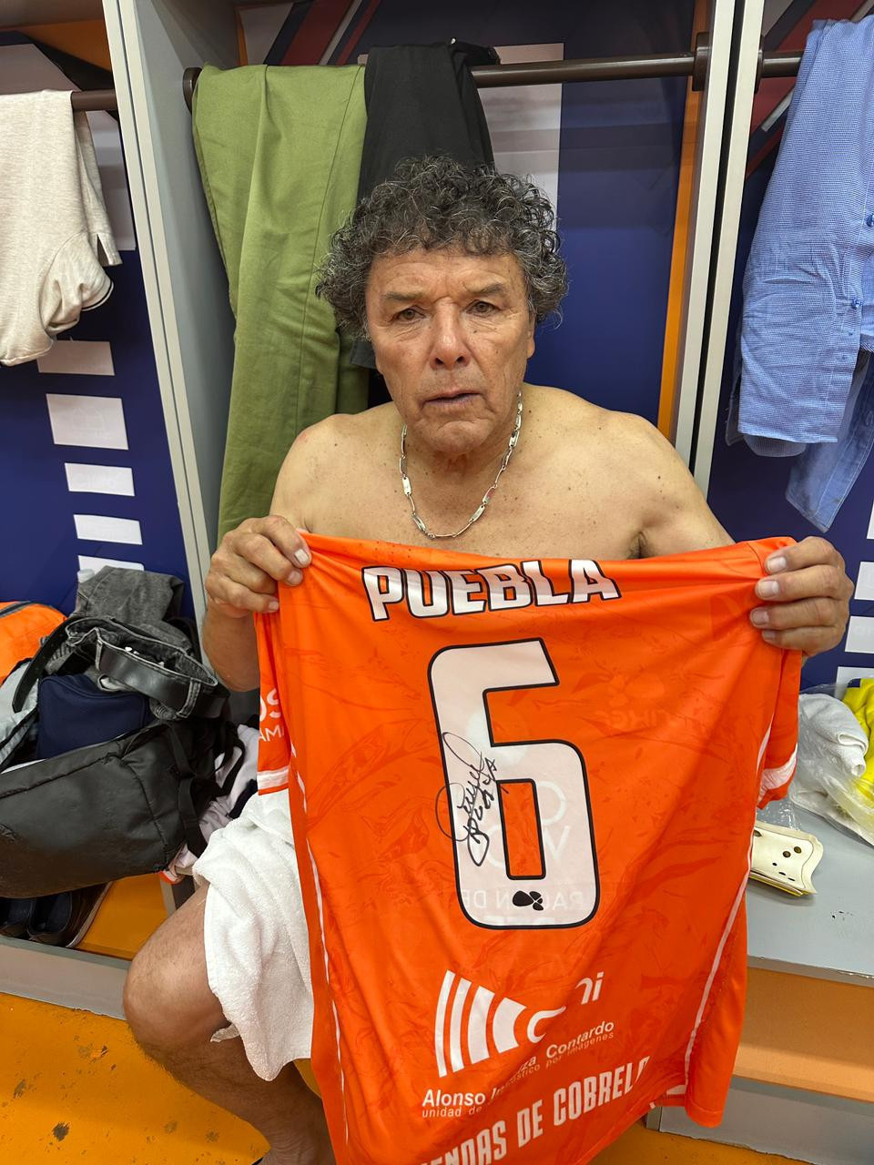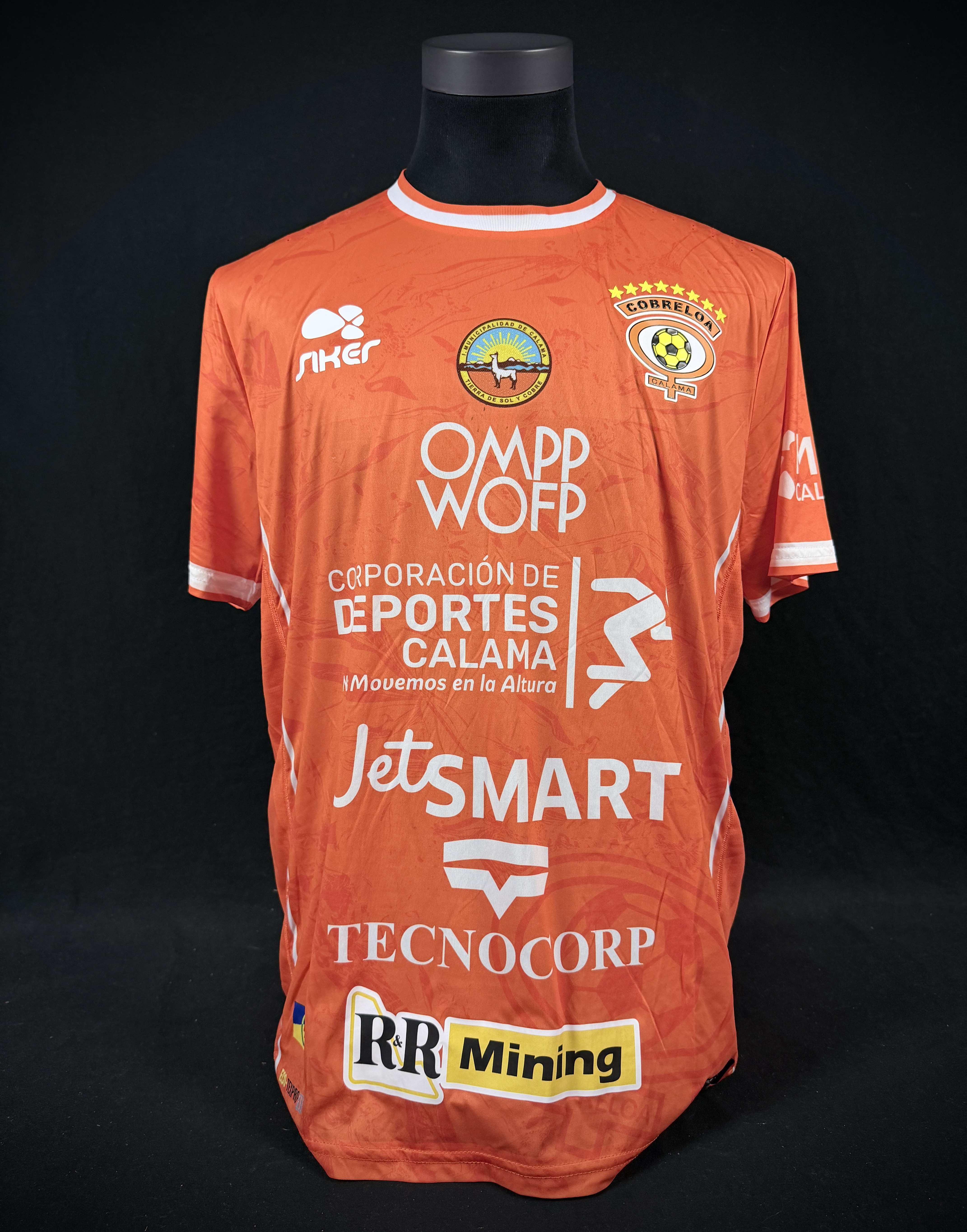 NOTE 1: UNWASHED AND SIGNED. Jersey worn by cobreloa most historic player, Héctor "Ligua" Puebla on pitch for the friendly game celebrating the "Zorros del desierto" stadium re inauguration. Signed in black pen on the back number.