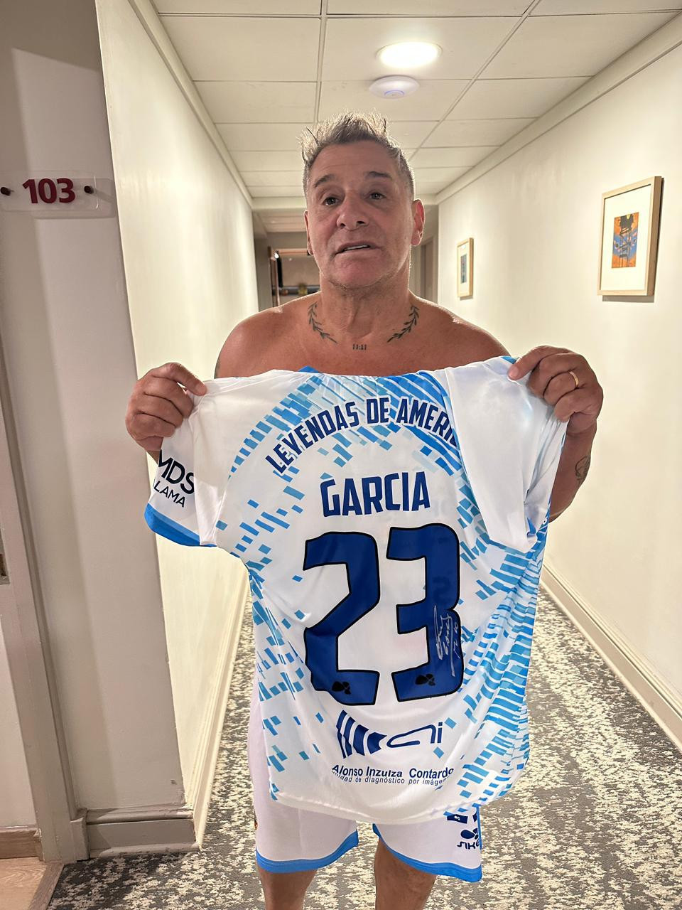 NOTE 1: UNWASHED AND SIGNED. Jersey worn by "El Turco" on pitch for the friendly game celebrating the "Zorros del desierto" stadium re inauguration. Signed in silver pen on the back number.