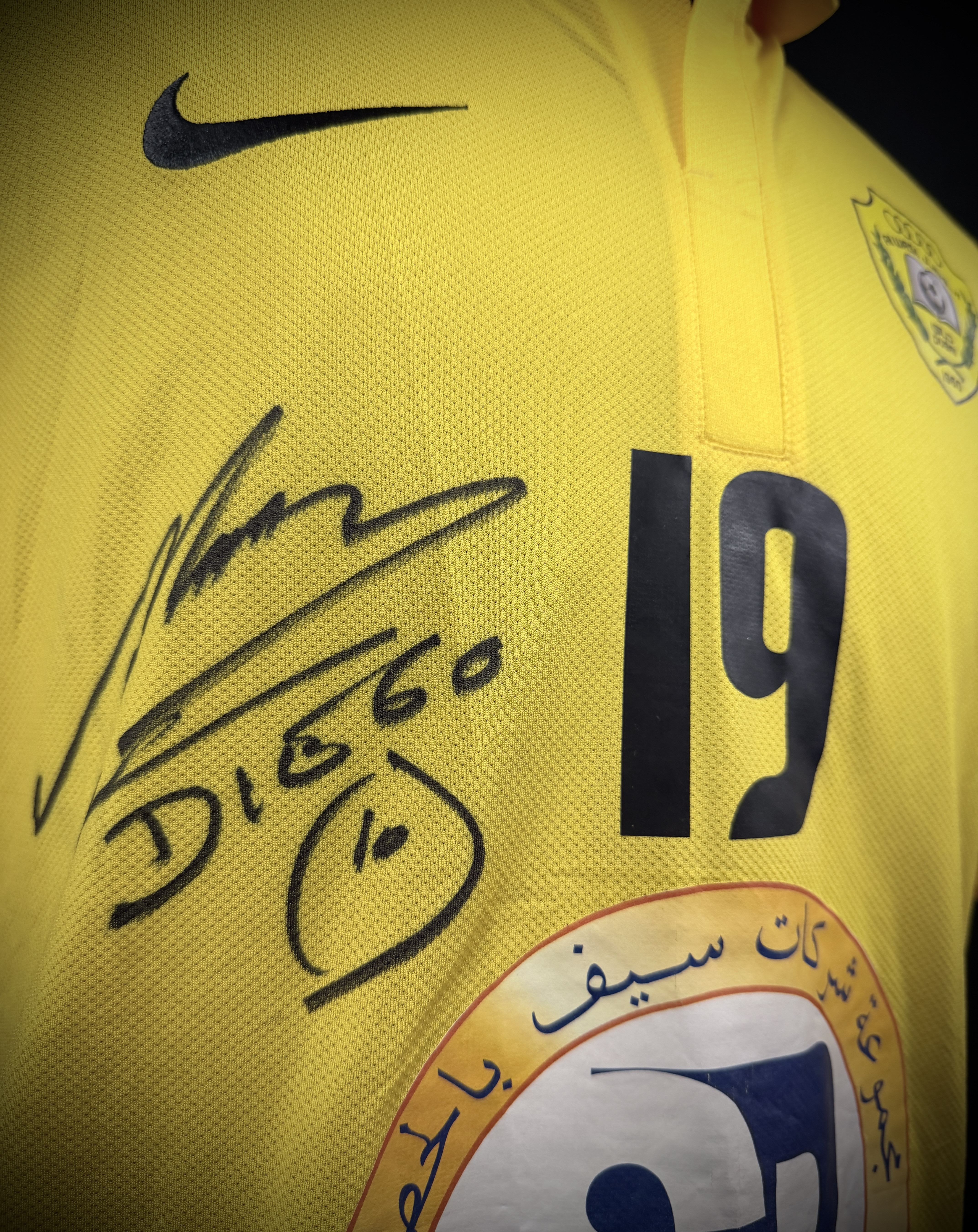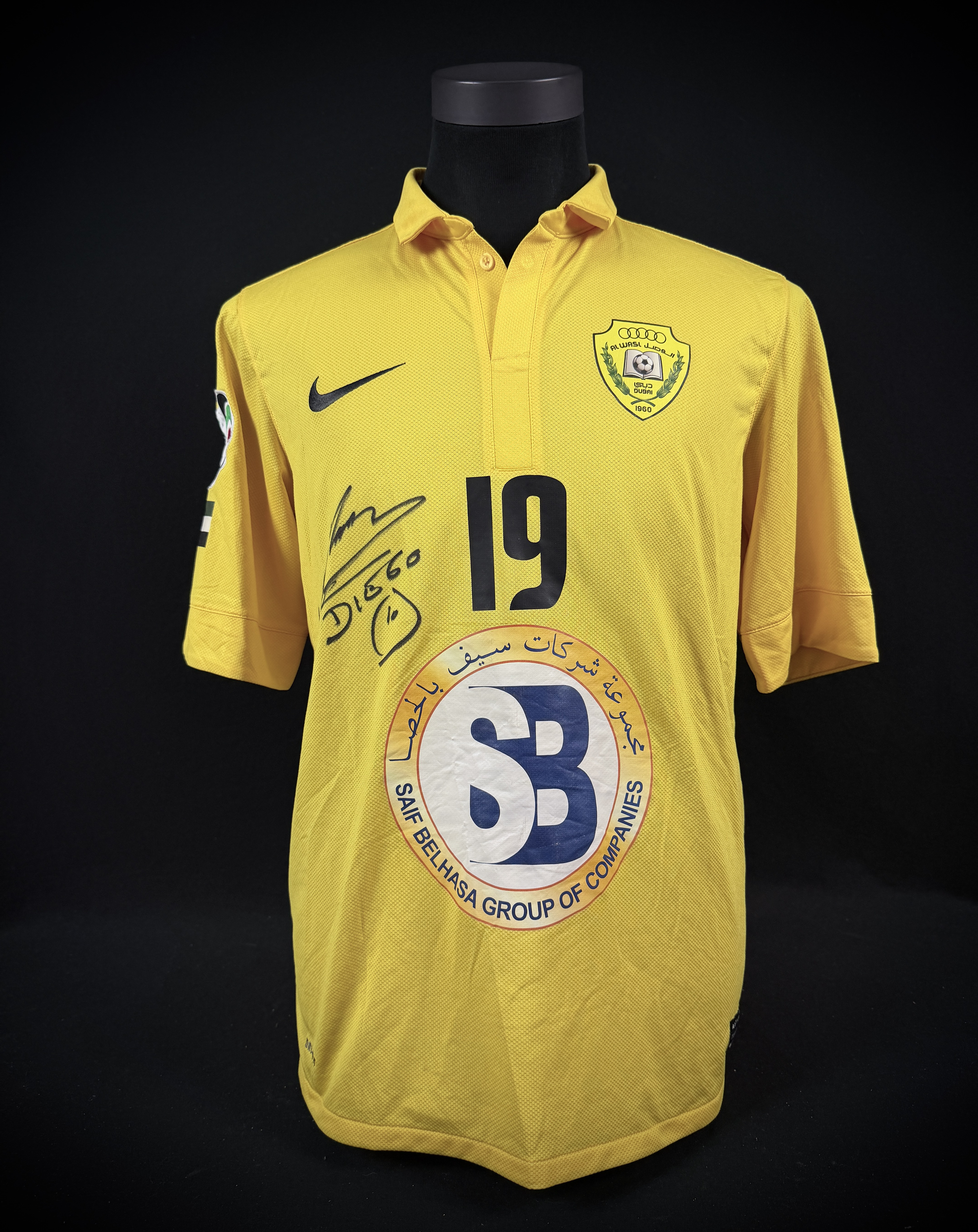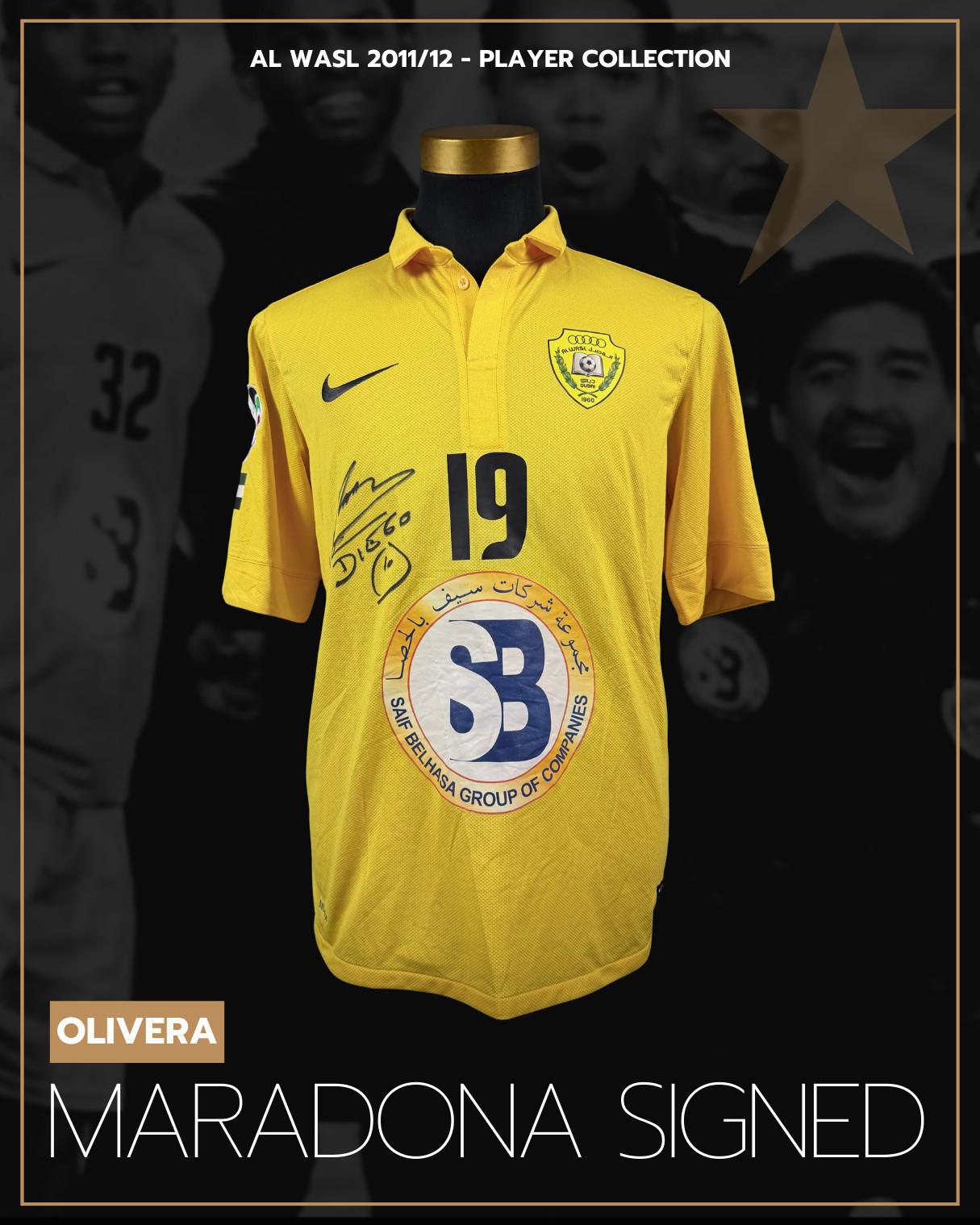 NOTE 1:SIGNED BY DIEGO. Jersey given as a gift by his teammate and close friend Juan Manuel Olivera when he was coached by Diego Maradona at AL-Wasl. Amazing clear signature by Diego on front with balck marker.
