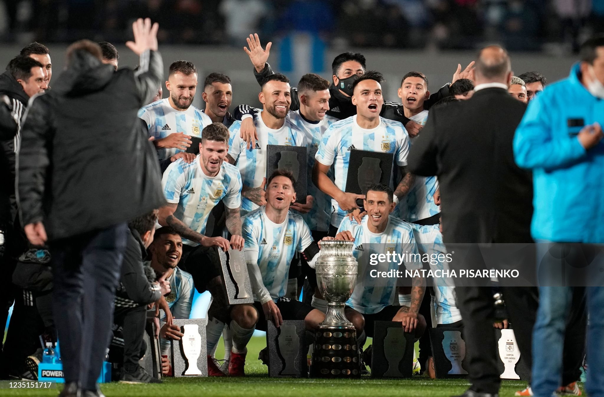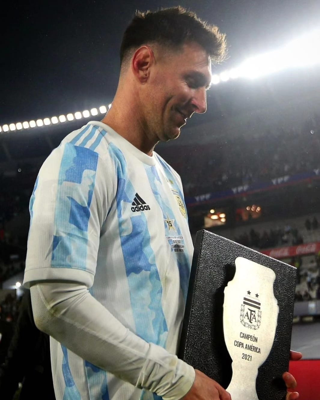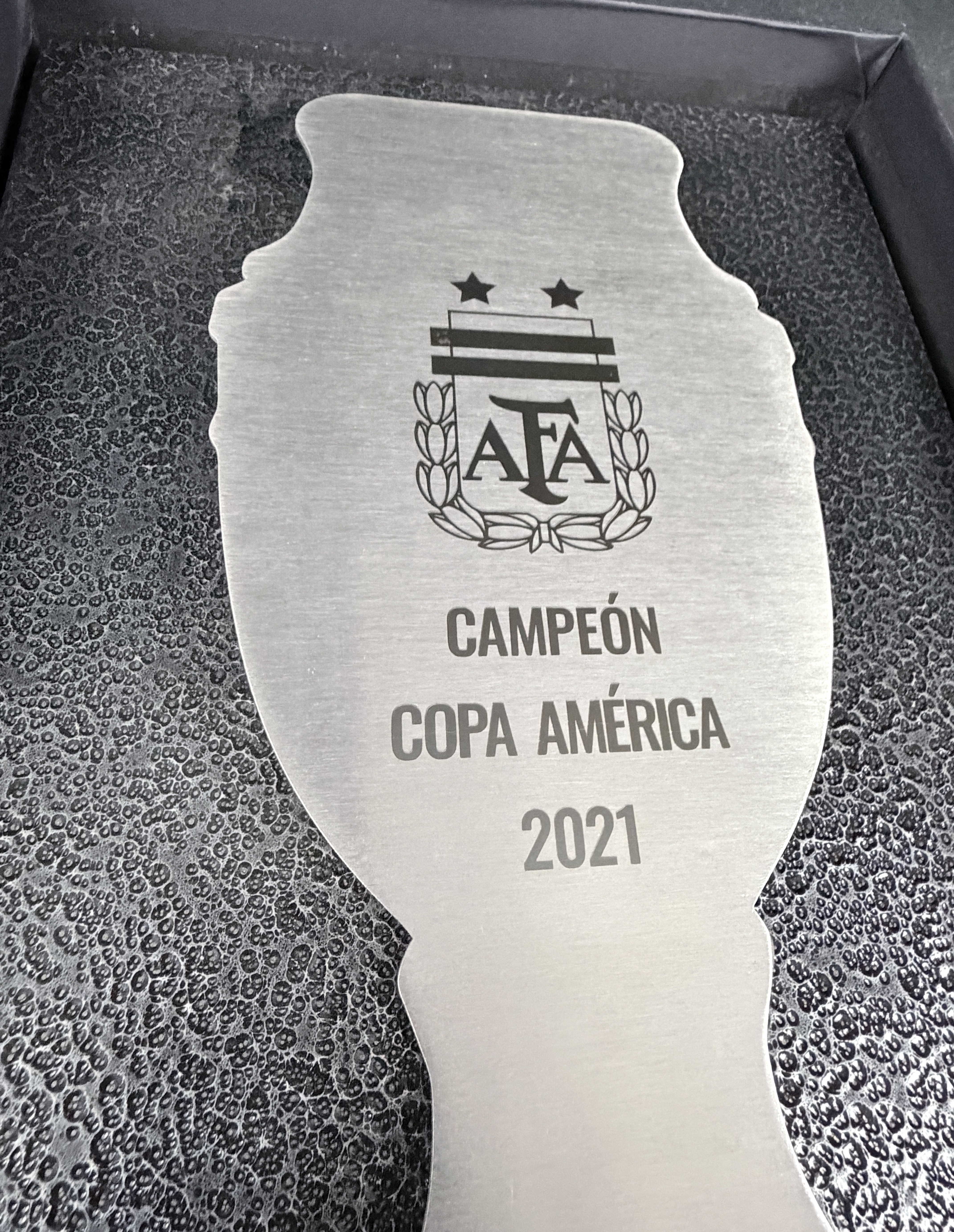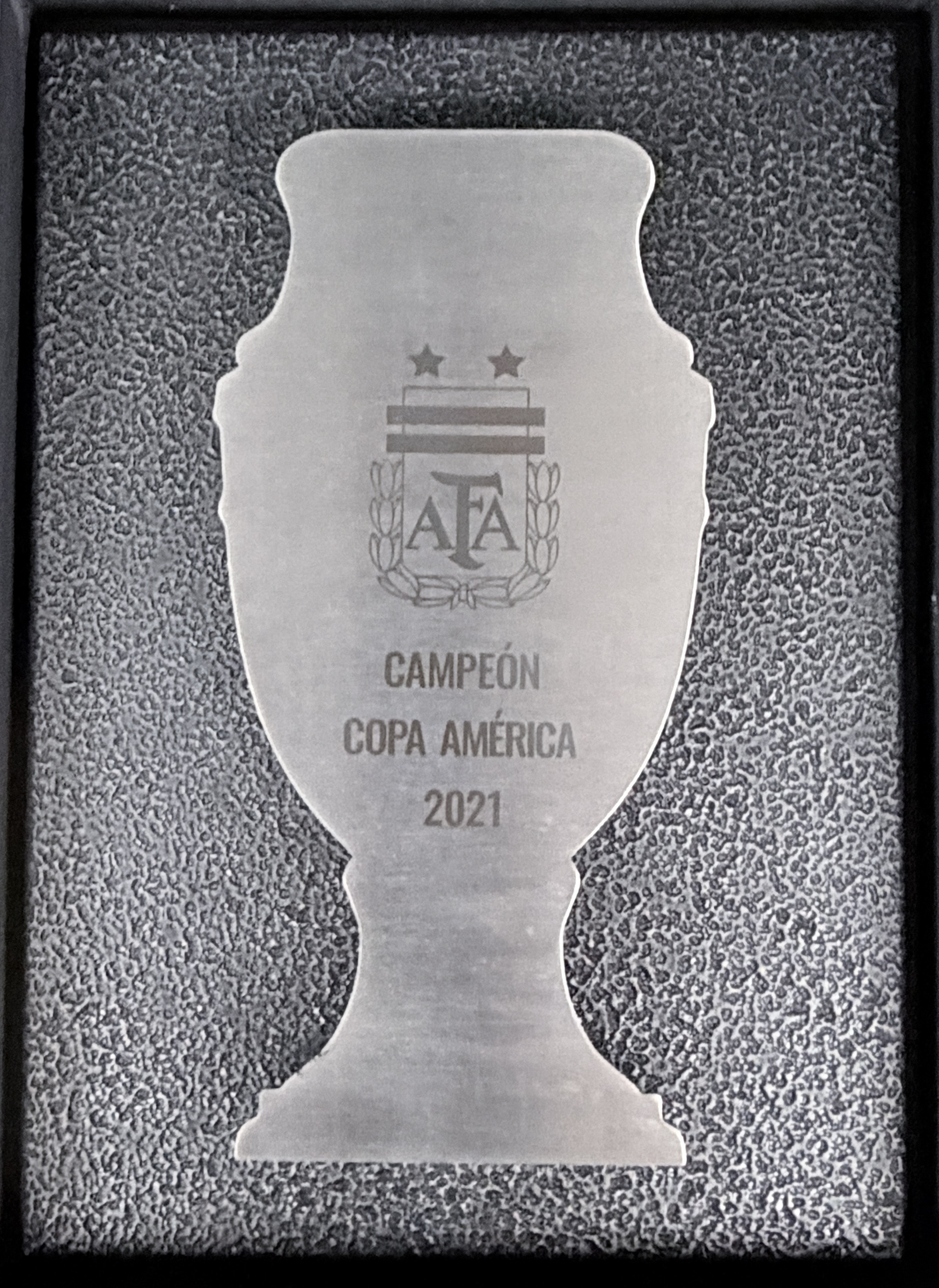 NOTE 1: This special and exclusive box made in steel materia in relief with a metal base was issued for each member of the Argentinian national team players champions in America Cup 2021, and was delivered, in a ceremony after game, for the next official game played in Argentina for World Cup Qualifiers against Bolivia on September 09th, 2021.