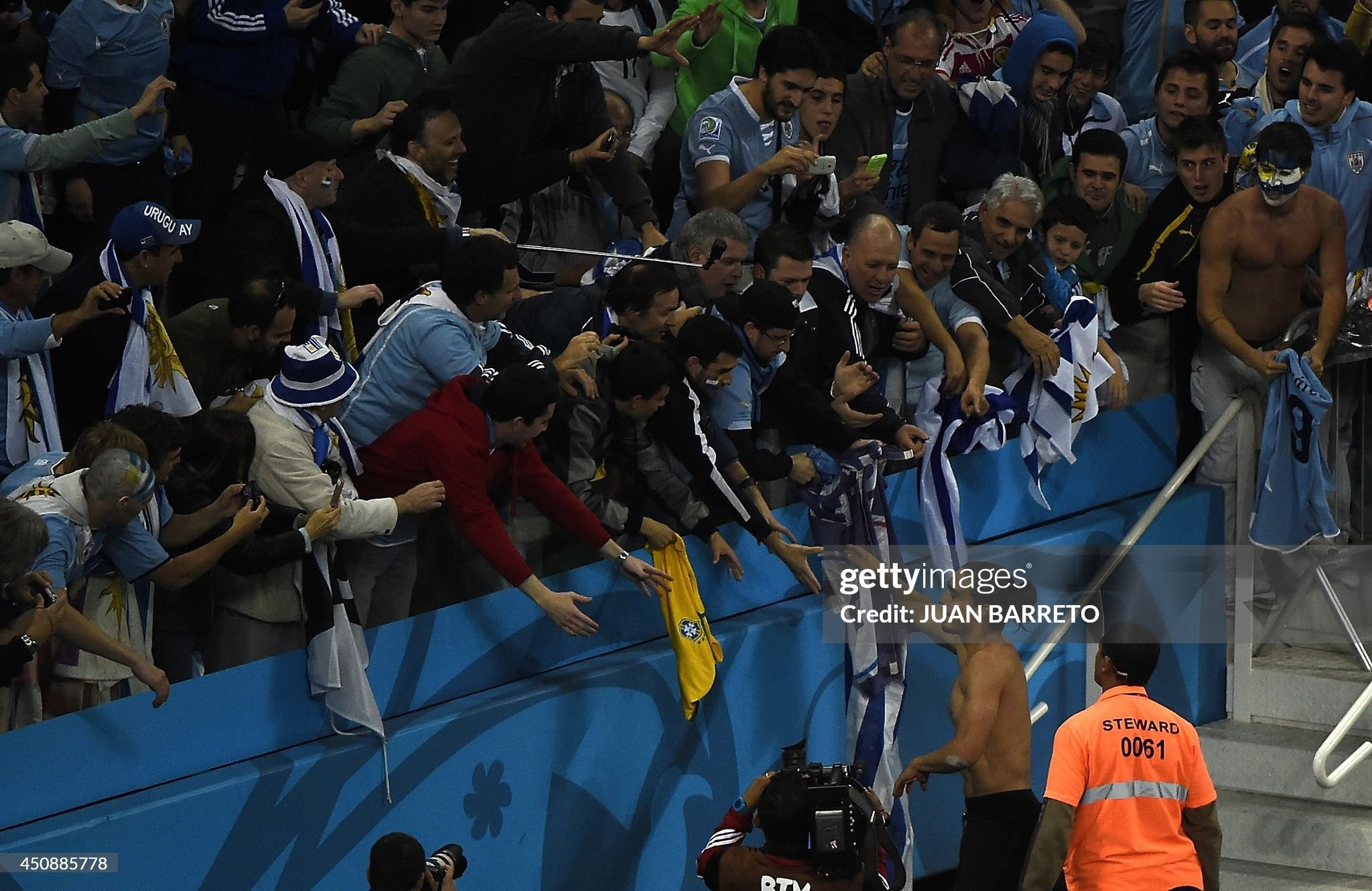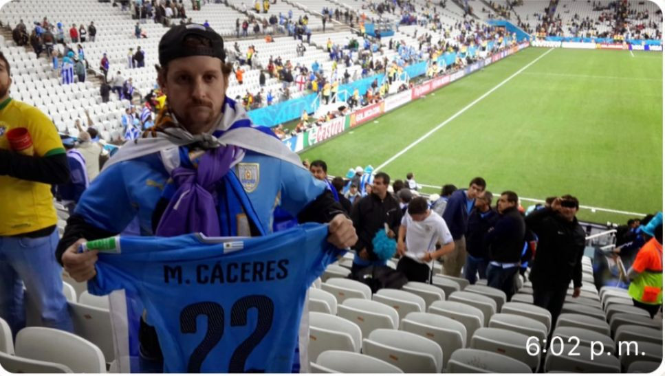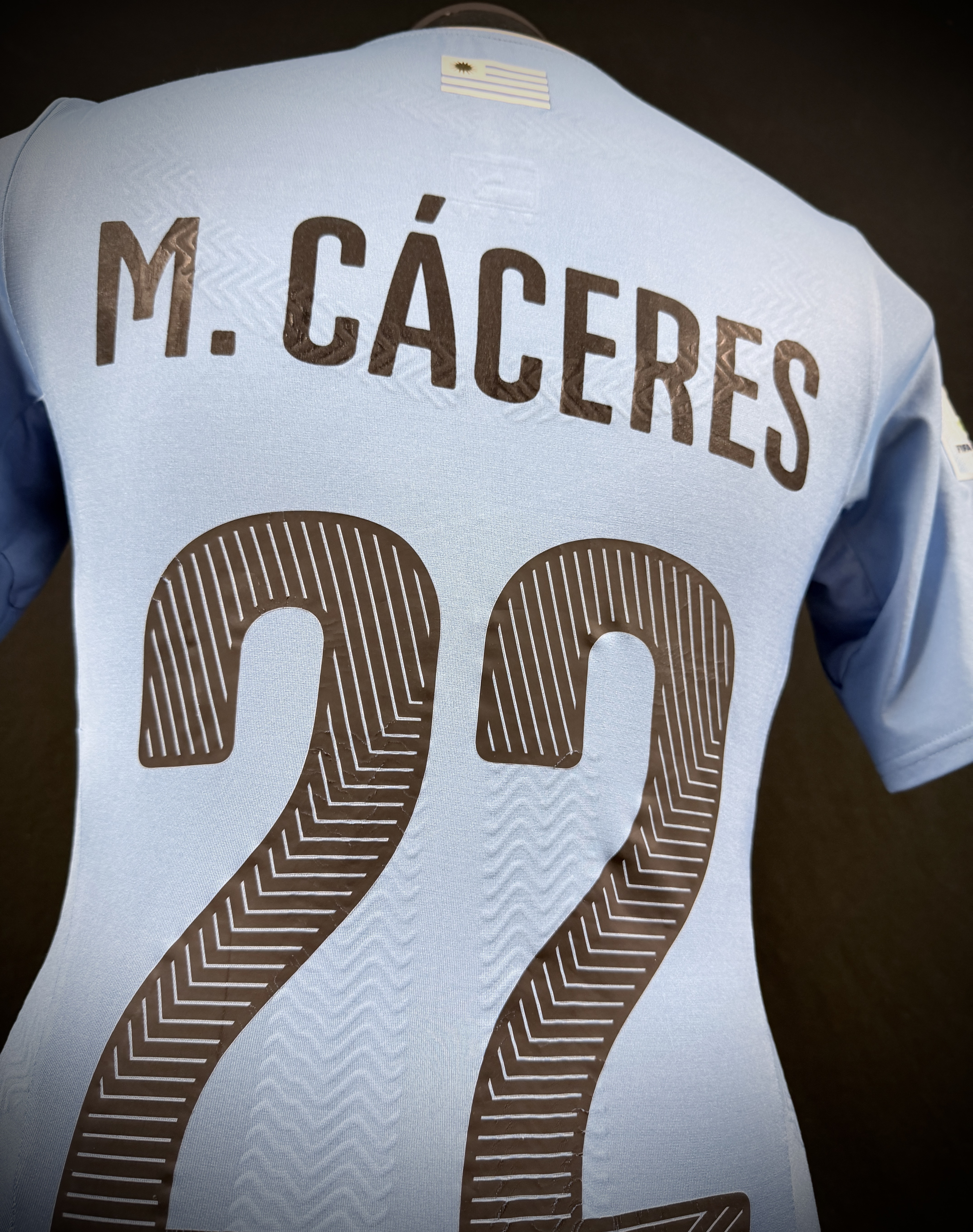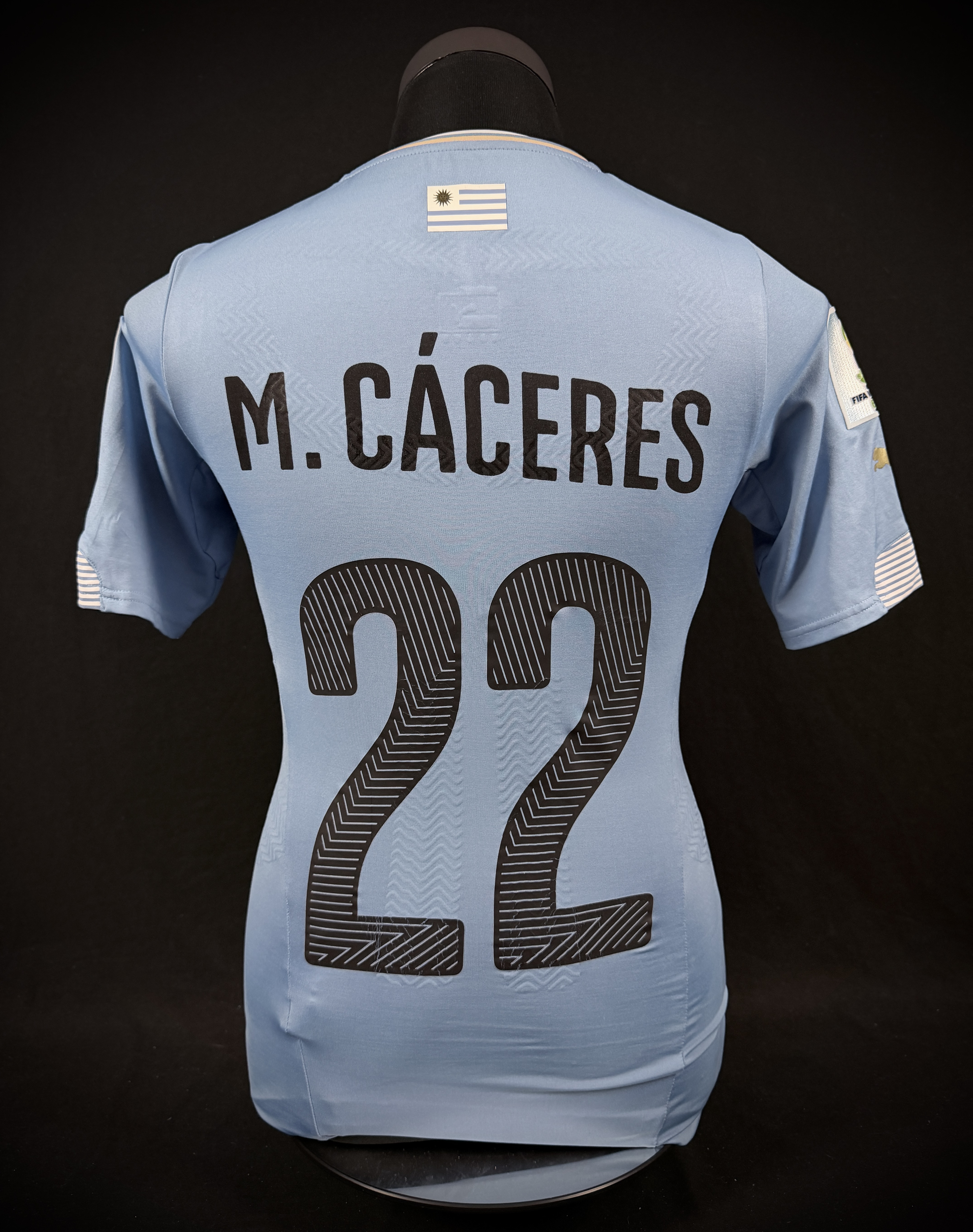 PROVENANCE: UNIQUE STORY. Jersey thrown just after the match from Martín Caceres to the uruguayan fans at the stand. Jersey comes in original source from the uruguayan fan who received the jersey that day and then got by current well known uruguayan collector.. AMAZING PHOTOPROOF STORY PROVENANCE.SEE ATTACHED.