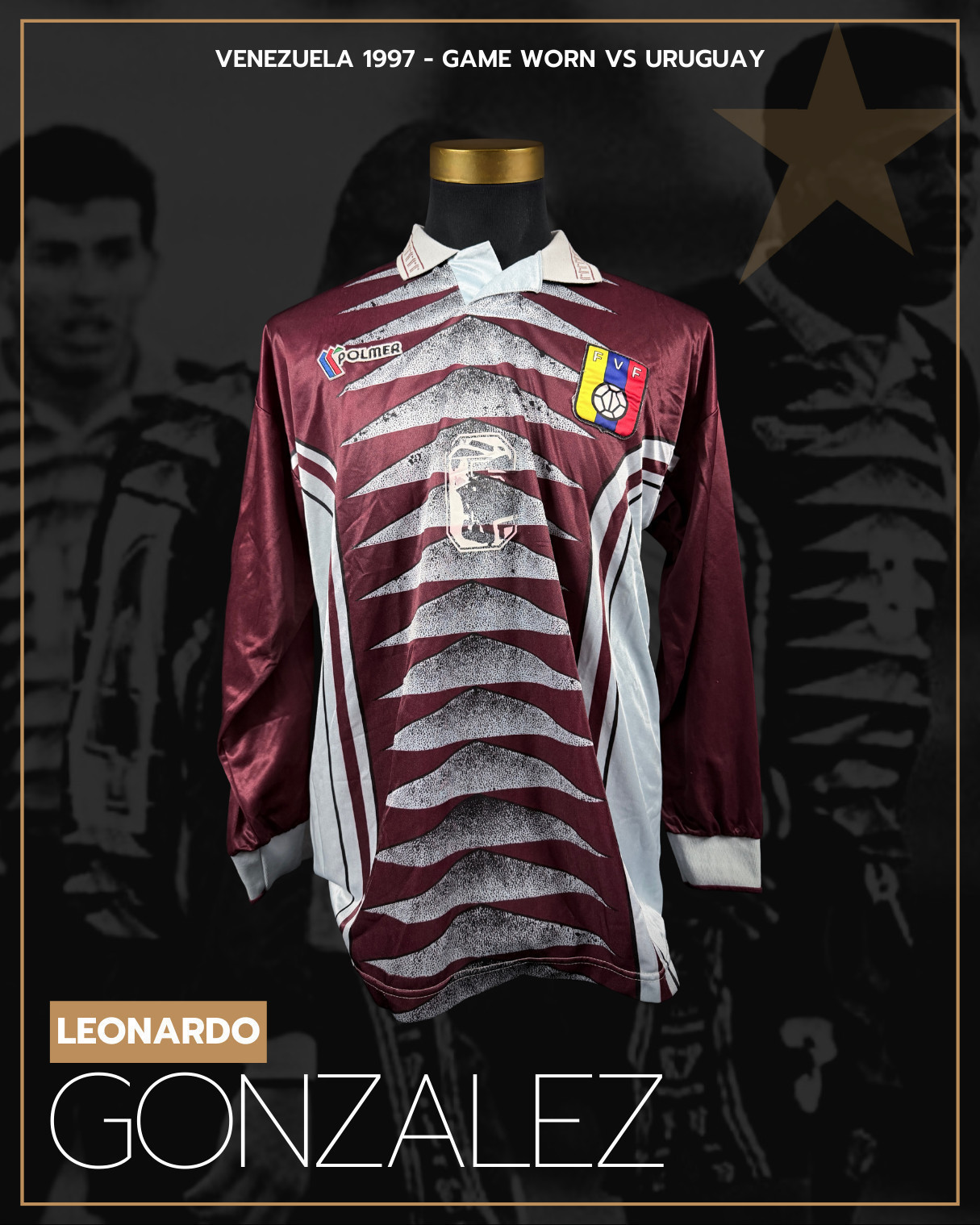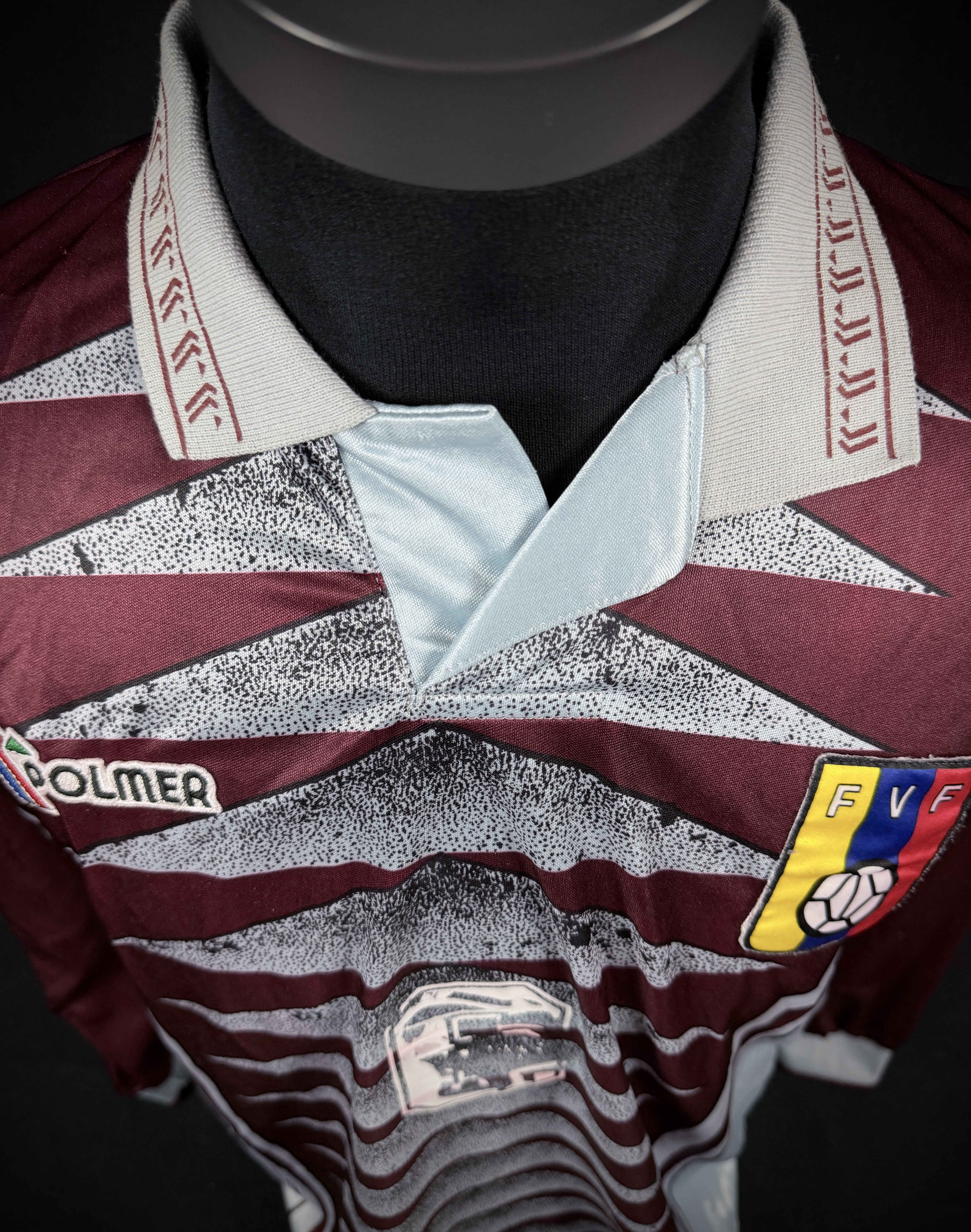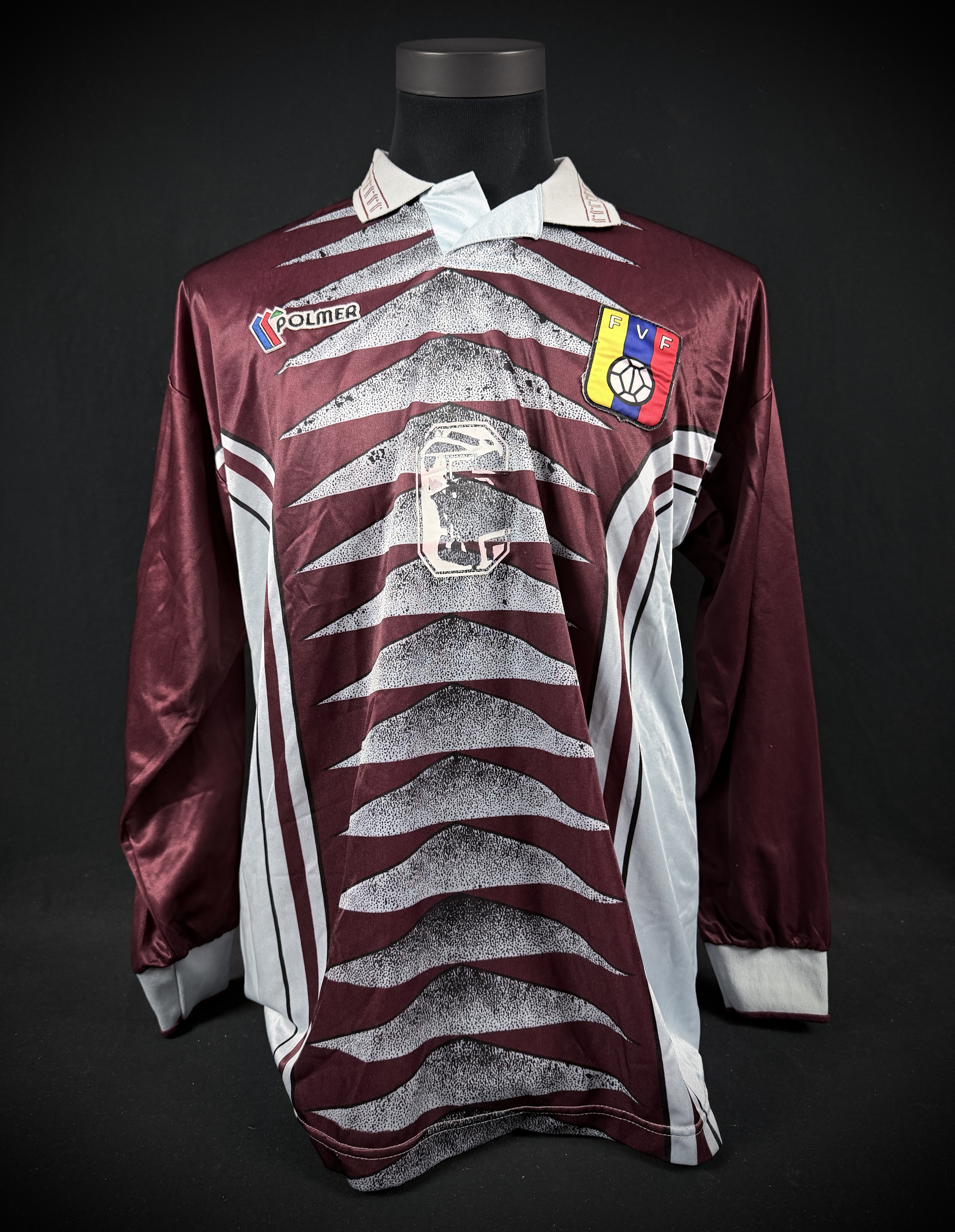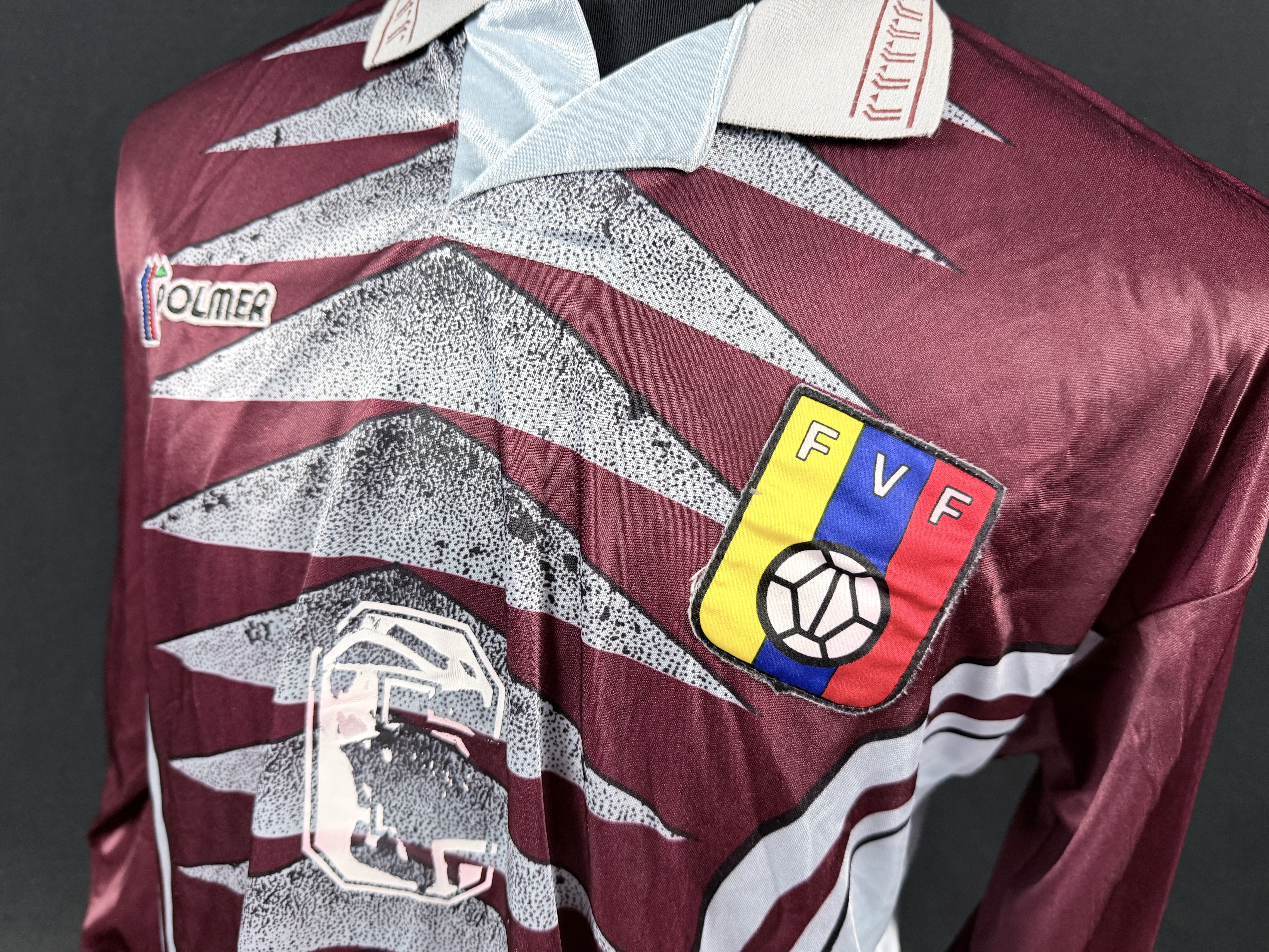 NOTE 1: RARE AND EXCLUSIVE JERSEY. Rare and hard to find 1997 Venezuela national team home jersey, made by Polmer. Worn during America Cup and some world cup qualifiers match, example vs Argentina and Perú and 1997. Polmer was brand garment for Venezuela national team only in 1996 and 97.