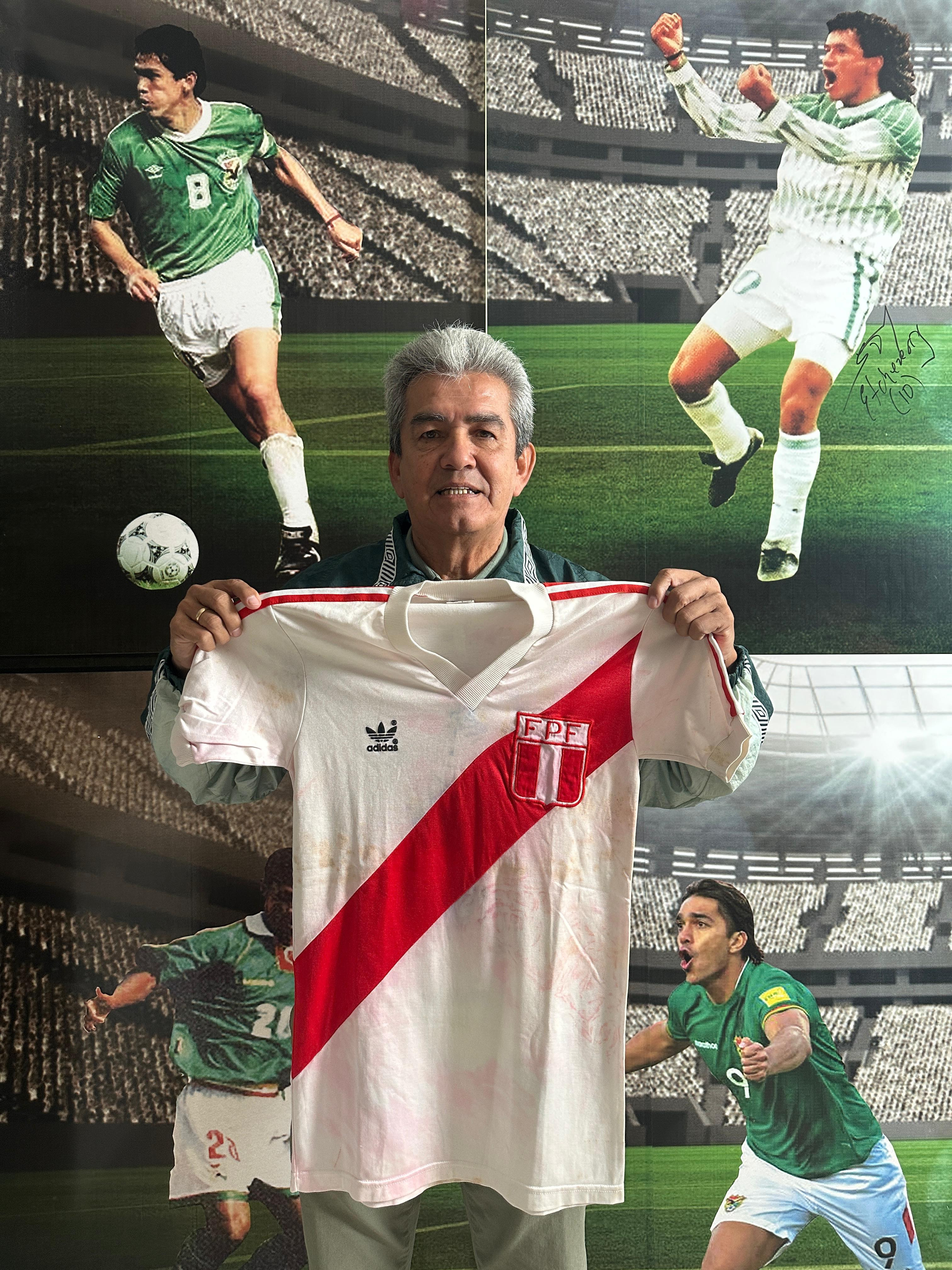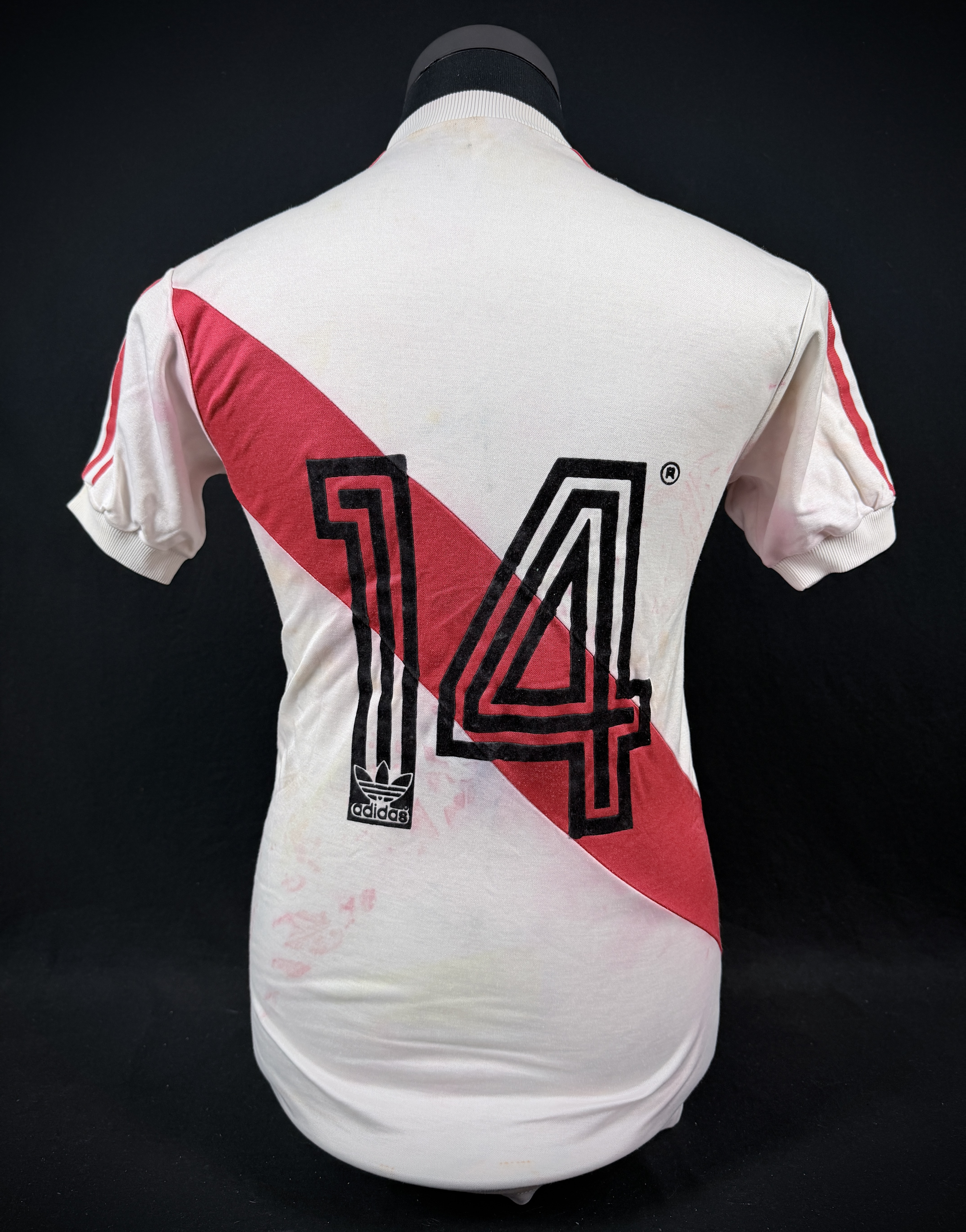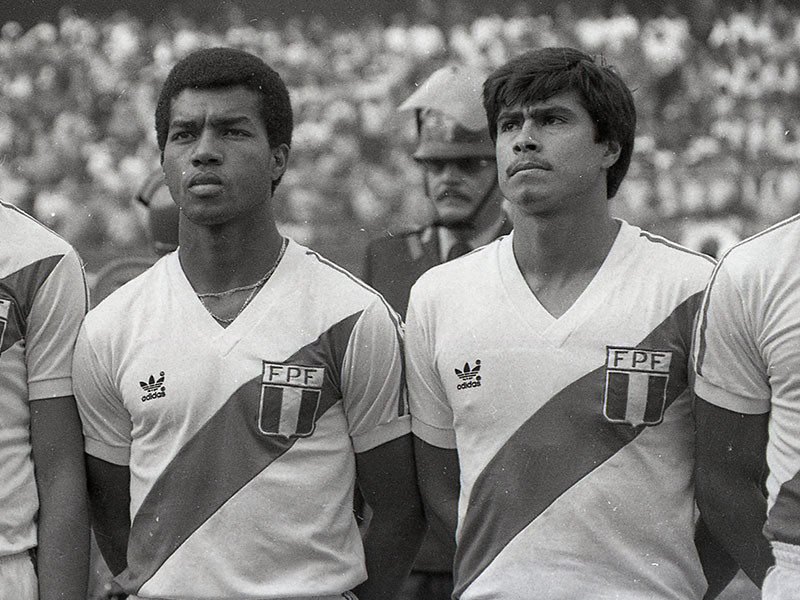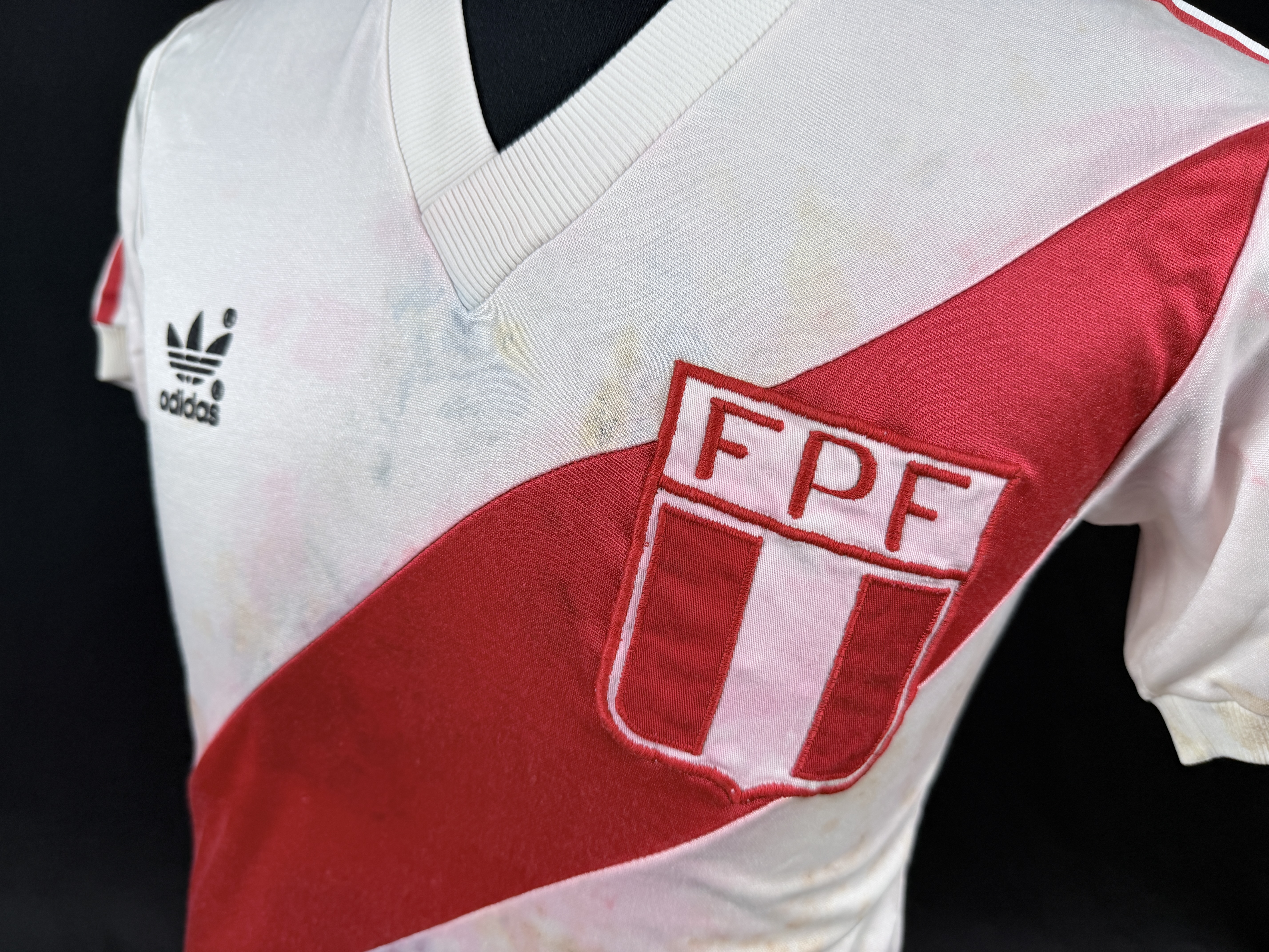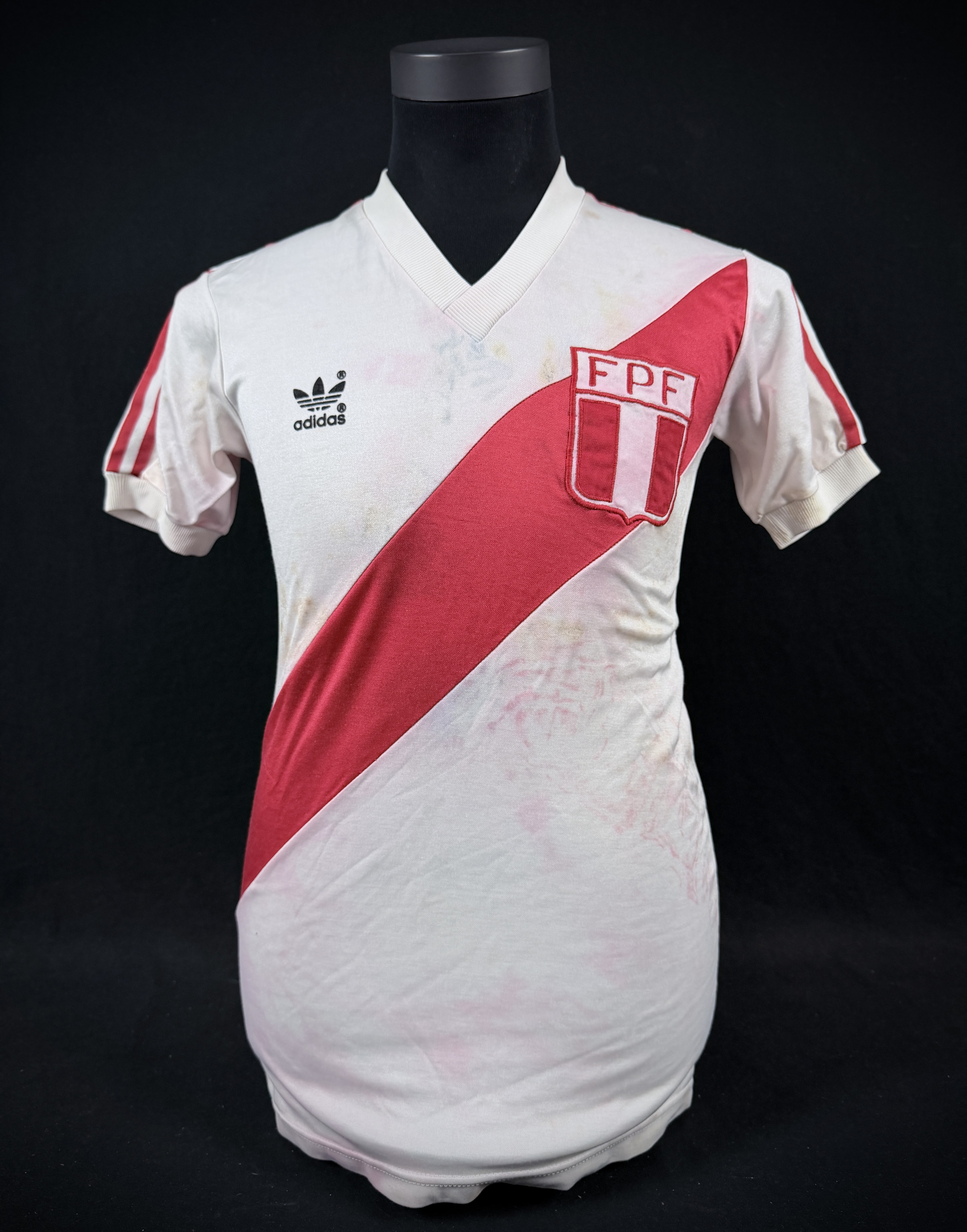 NOTE 1: SMALL SIZE ADIDAS LOGO. Nice design worn from 1982 with a small size adidas. Jersey worn on pitch by peruvian #14 on May 1st, 1985 during friendly game and swapped with milton Melgar after the match.