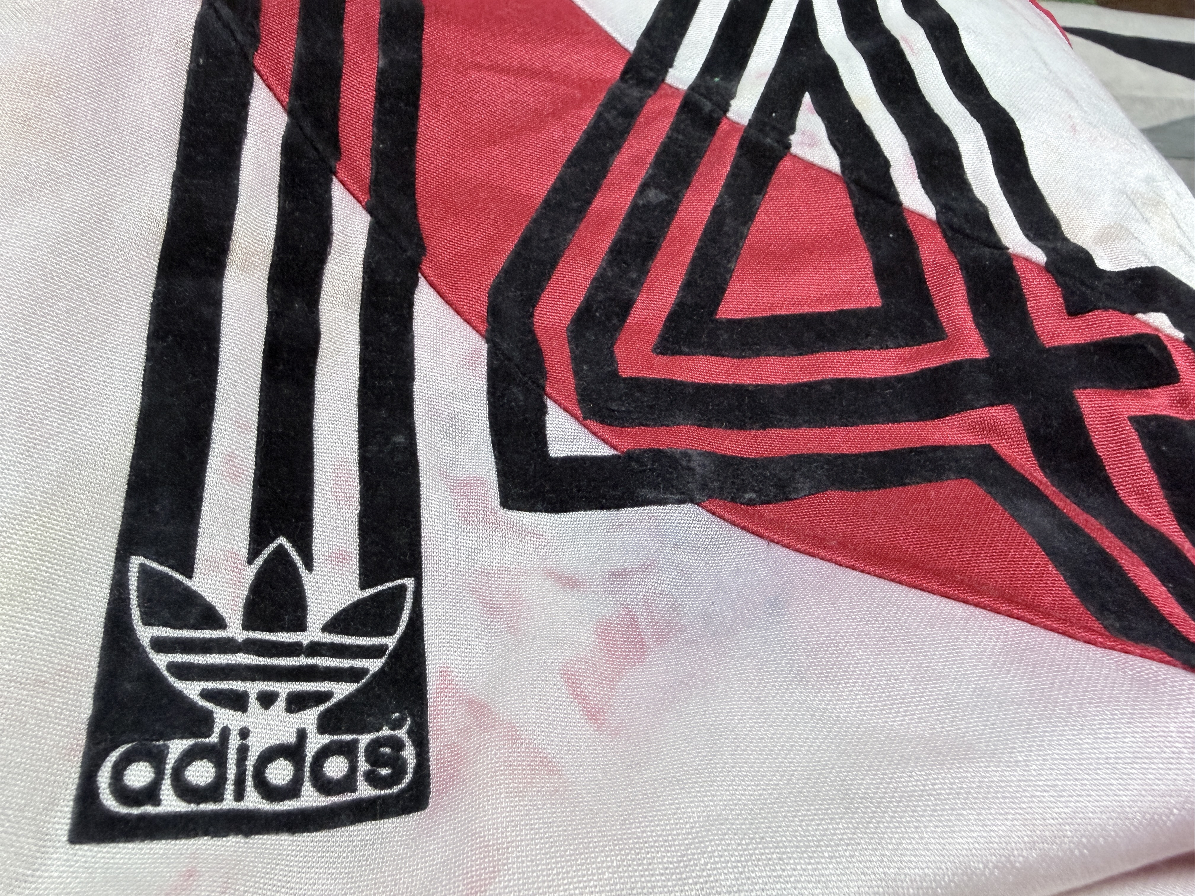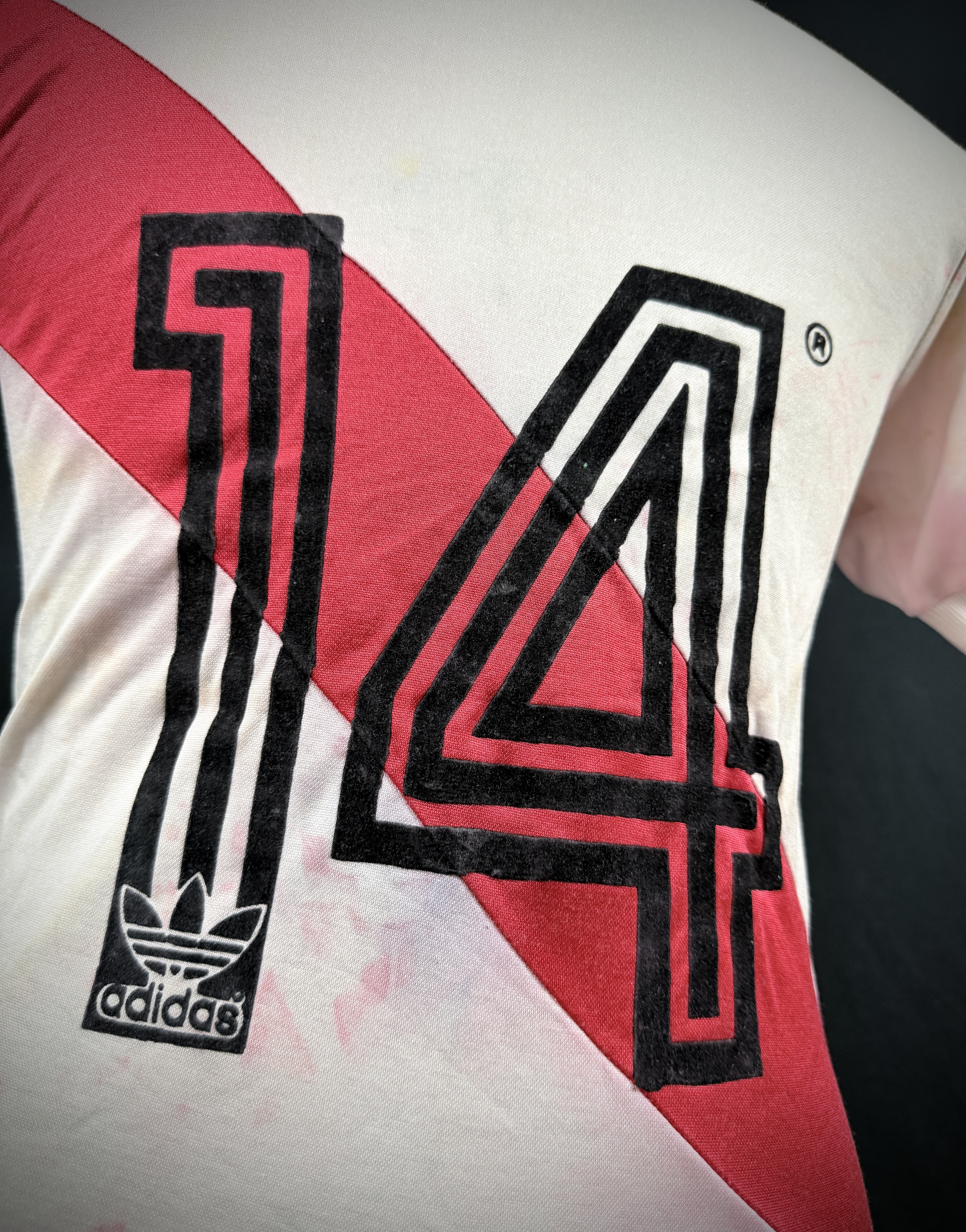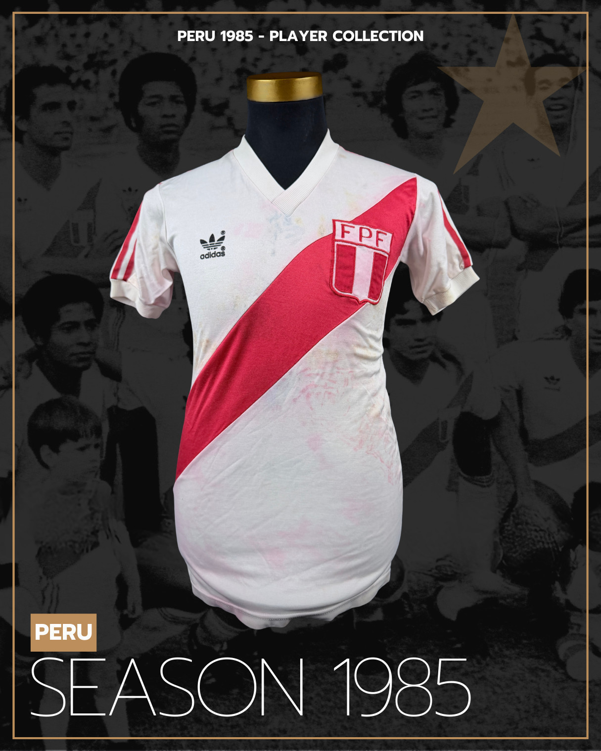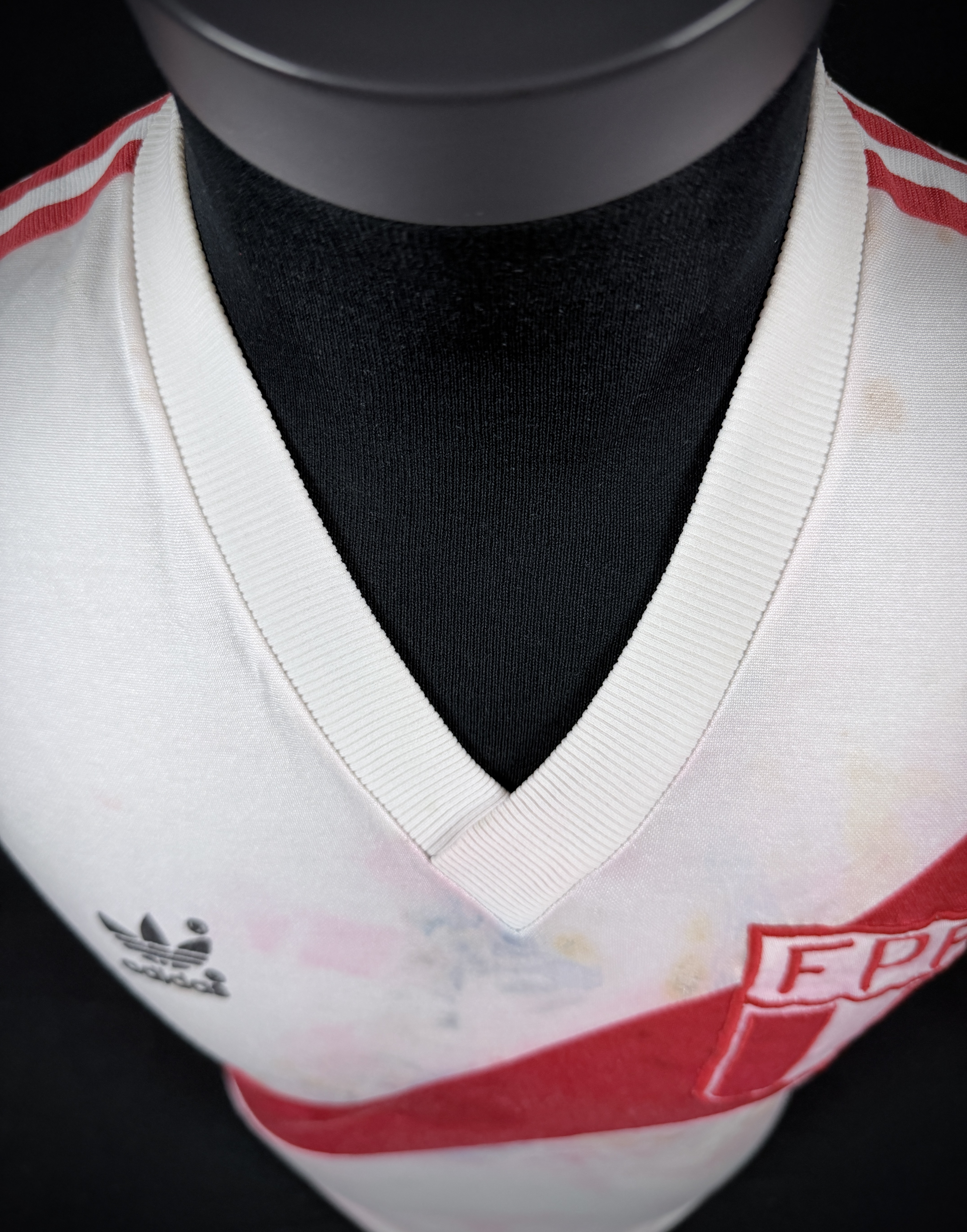 NOTE 1: SMALL SIZE ADIDAS LOGO. Nice design worn from 1982 with a small size adidas. Jersey worn on pitch by peruvian #14 on May 1st, 1985 during friendly game and swapped with milton Melgar after the match.